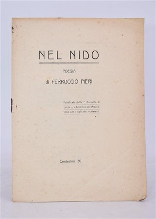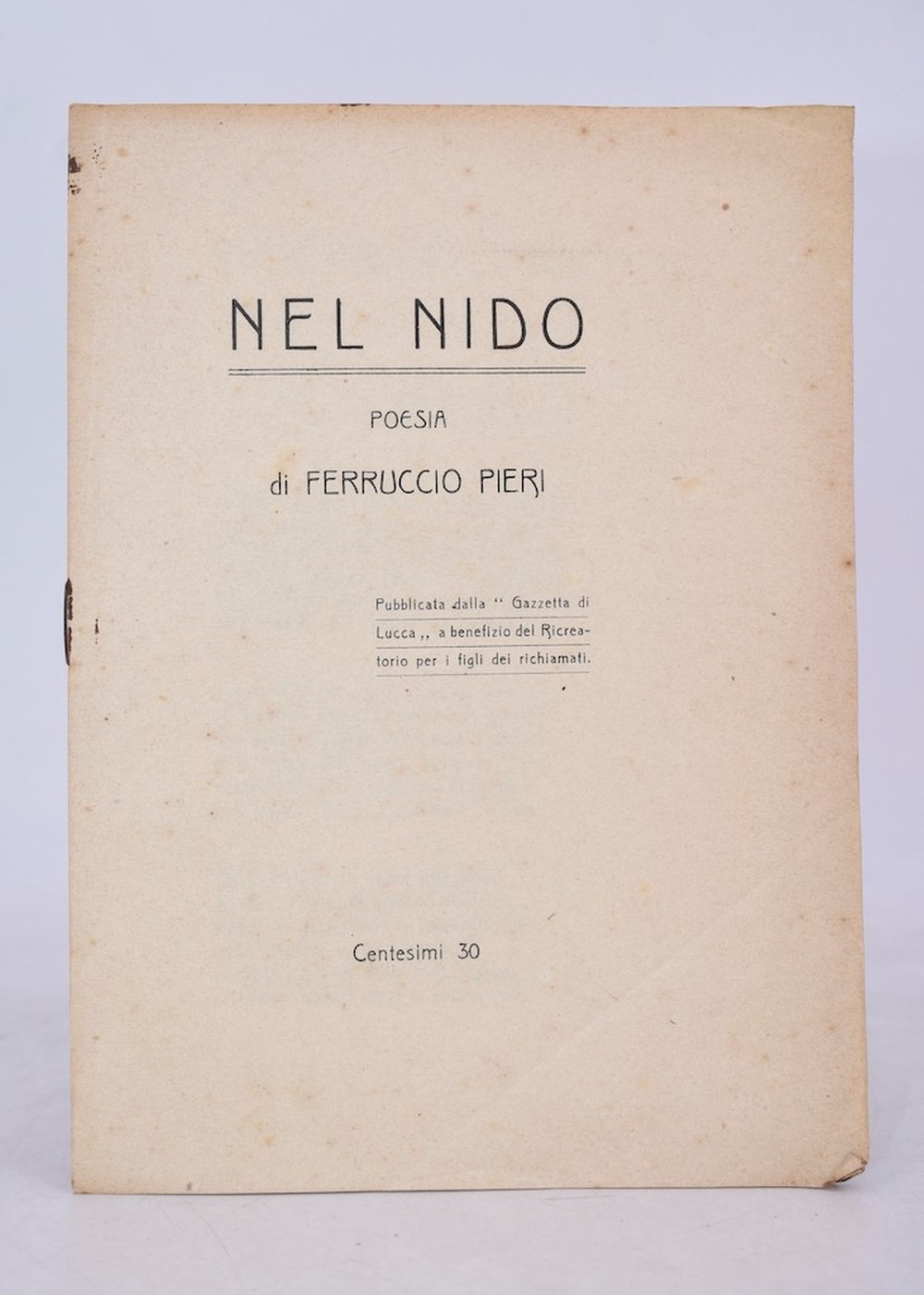 Prima edizione del componimento in versi di Ferruccio Pieri. Quattro carte non numerate. Pubblicazione Gazzetta di Lucca per il Ricreatorio dei Figli dei Richiamati.