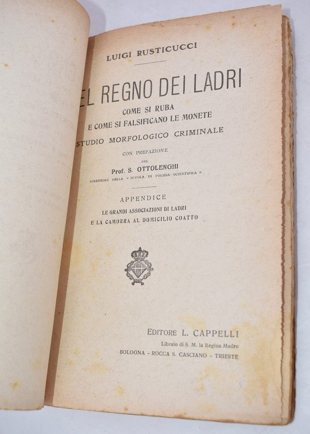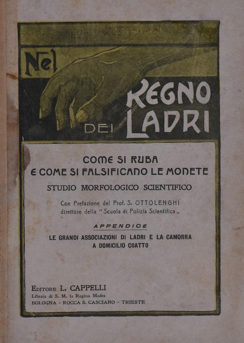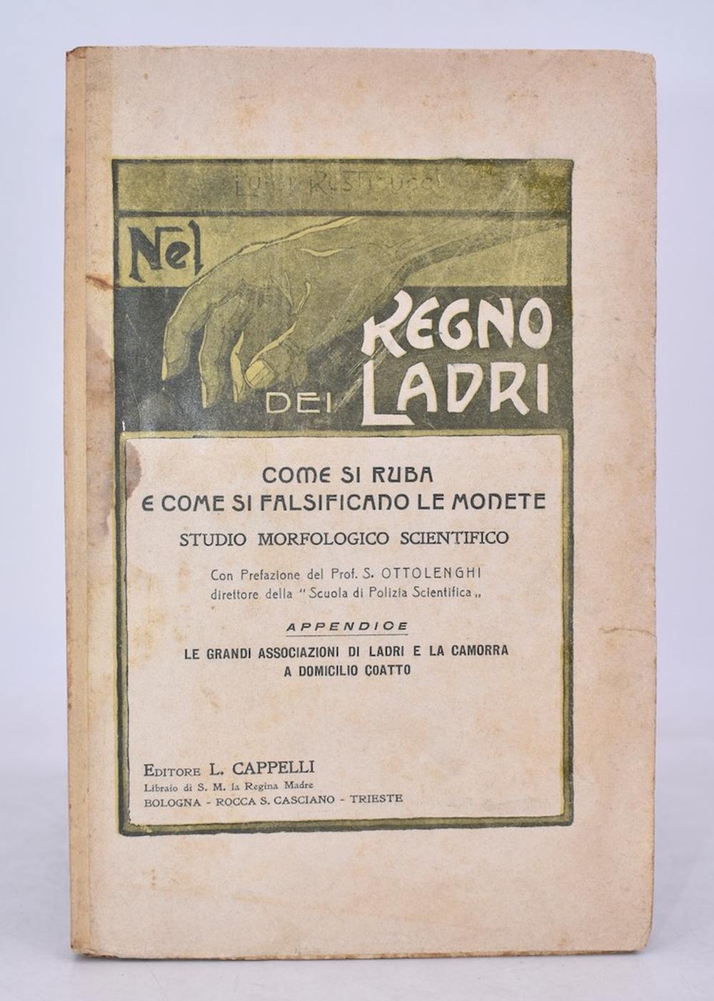 Prima edizione del saggio illustrato di criminologia sulle tecniche di furto, taccheggio e scippo e di falsificazione delle monete. Dal piatto: “con prefazione di S. Ottolenghi ; appendice: Le grandi associazioni di ladri e la Camorra al domicilio coatto”. Esemplare con restauro al dorso.