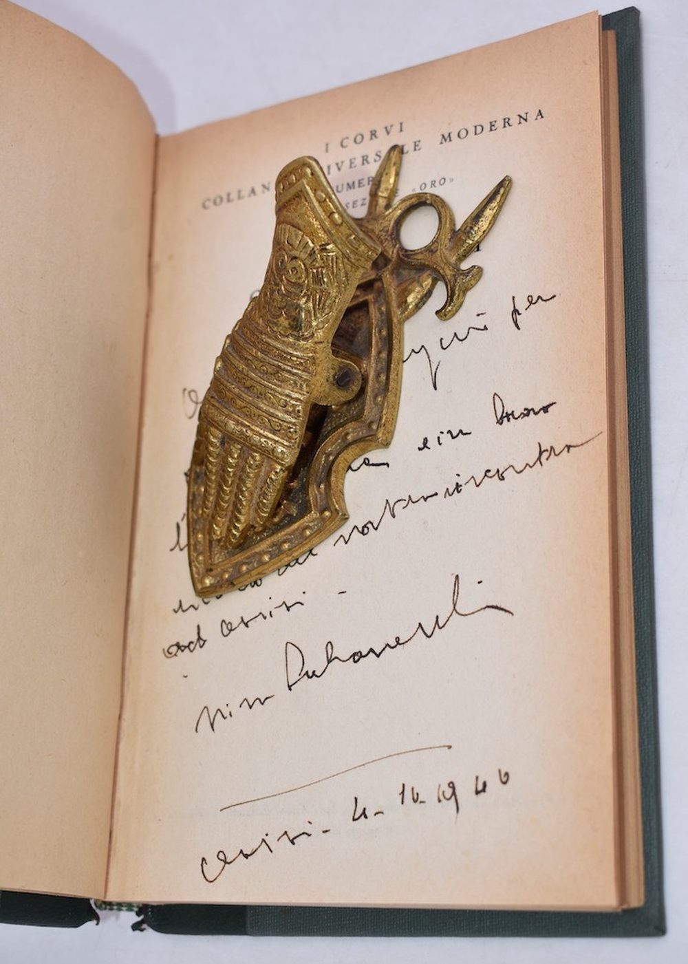 Nona edizione del saggio di Nino Salvaneschi, esemplare con dedica autografa dell'A. Legatura in mezza pelle verde mancante del dorso.