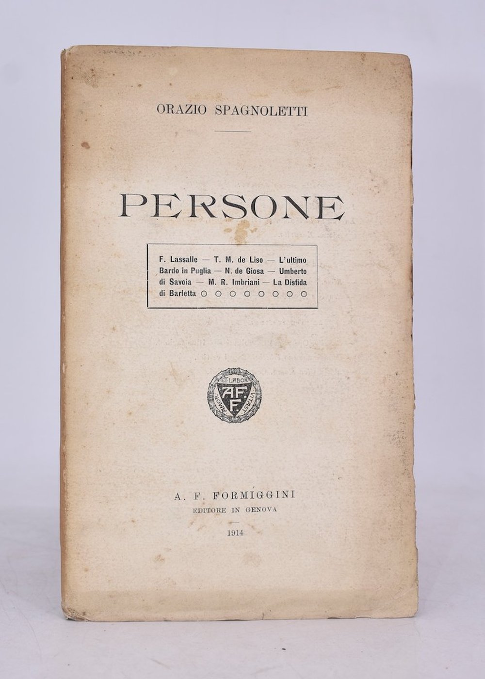 Prima edizione, esemplare nella brossura editoriale. Contiene: F. Lassalle; T. M. de Liso; L'ultimo bardo in Puglia; N. de Giosa; Umberto di Savoia; M. R. Imbriani; La disfida di Barletta.