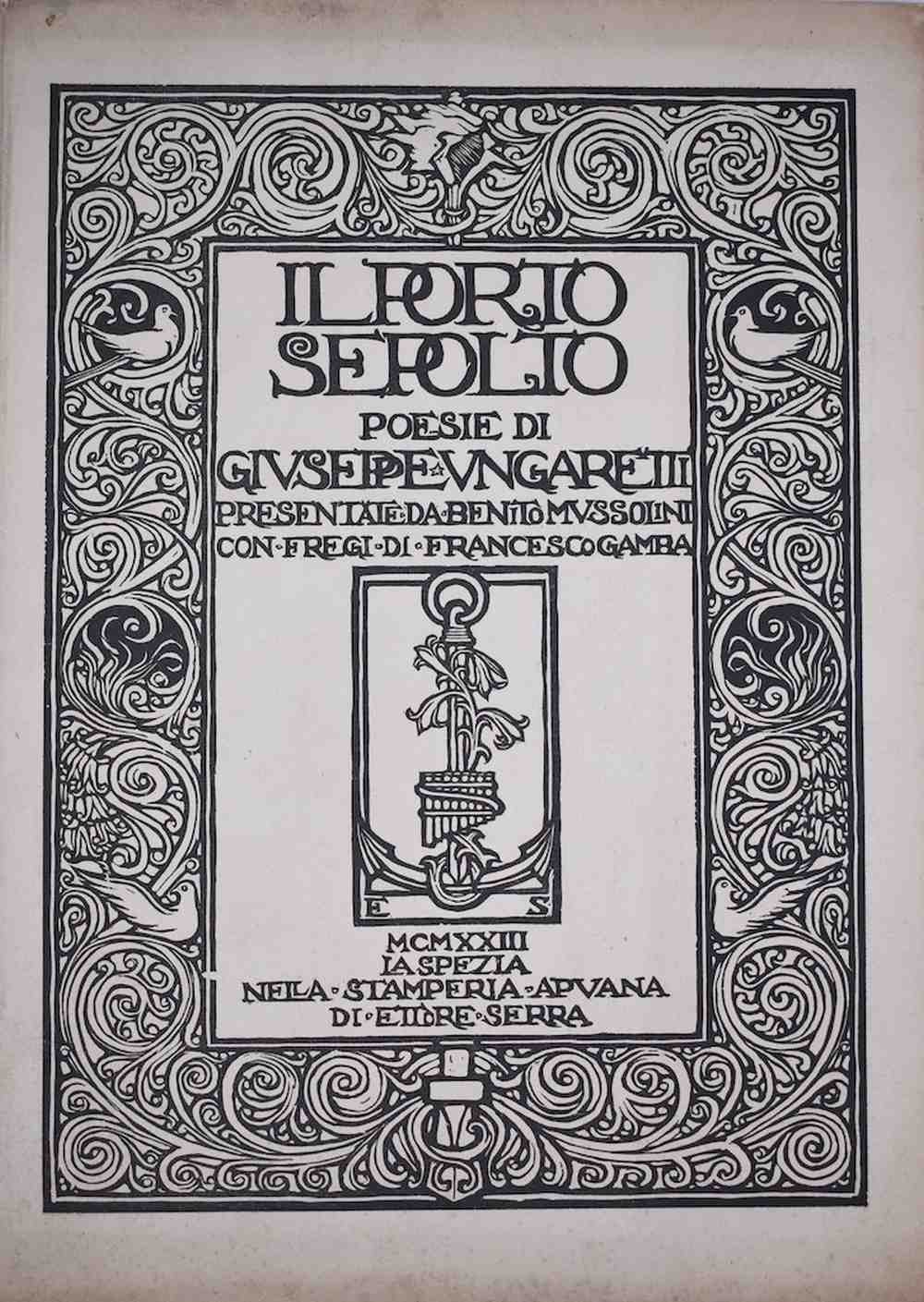 Seconda edizione (la prima è del 1916). Presentazione di Benito Mussolini. Fregi n.t. di Francesco Gamba. Tiratura numerata, es. n. 4/500, con dedica autografa dell'A. a suo discepolo. Volume conservato nella raffinata brossura editoriale illustrata.