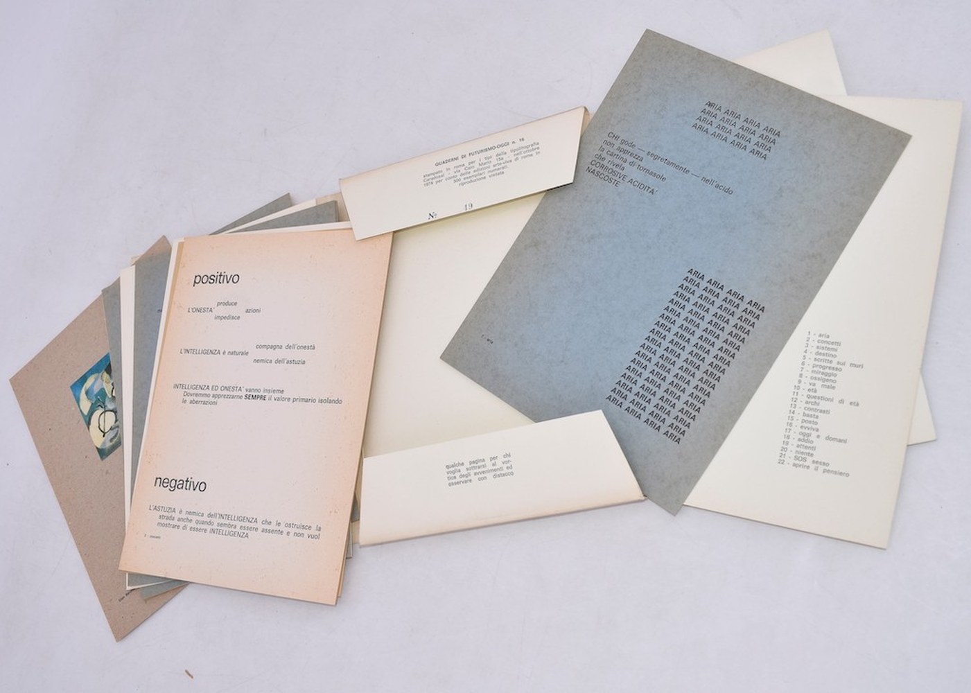 Tiratura numerata, esemplare n. 49/500, collezione Quaderni di Futurismo Oggi. Cartella a fogli mobili con 1 tavola illustrata.