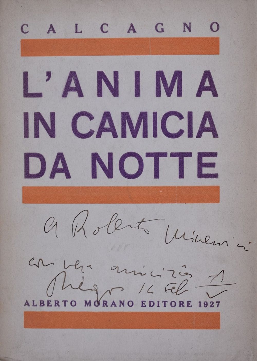 Prima edizione. Opera prima dello scrittore di Ercolano (1901-1979). Con un ritratto di Calcagno (disegno di Möller) in ultima c. Esemplare con dedica dell’autore manosc. al piatto, datata Anno V.