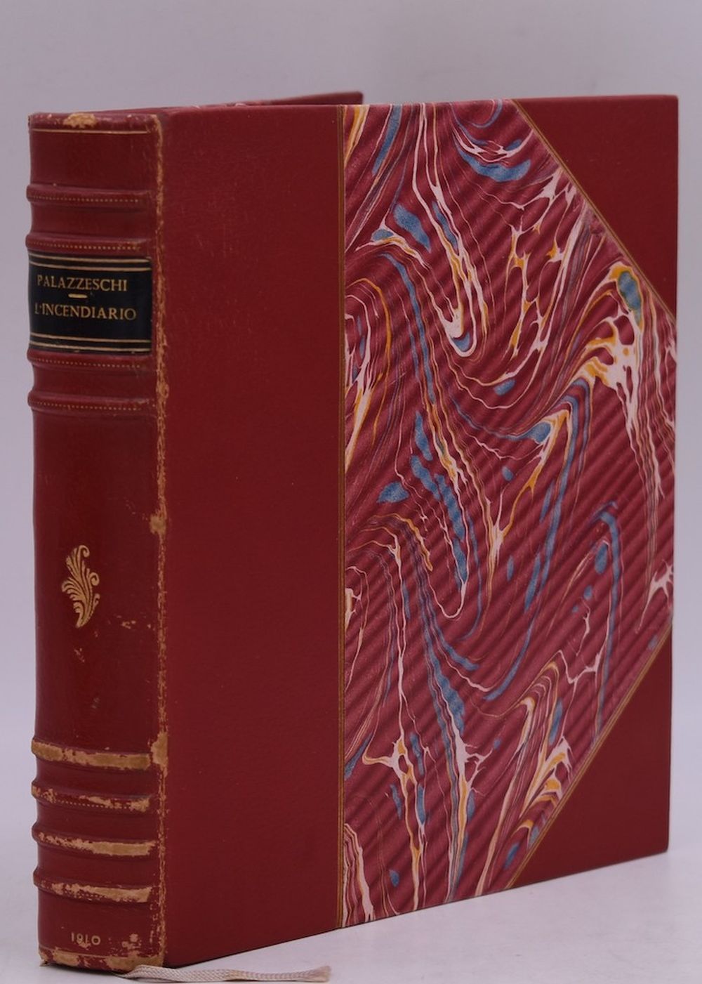 Prima edizione, tiratura di 1000 copie n.n. Legatura artistica in mezza pelle marocchino rosso con angoli, titoli con fregio in oro al dorso e taglio sup. dorato, con la brossura conservata. Cofanetto marmorizzato.
