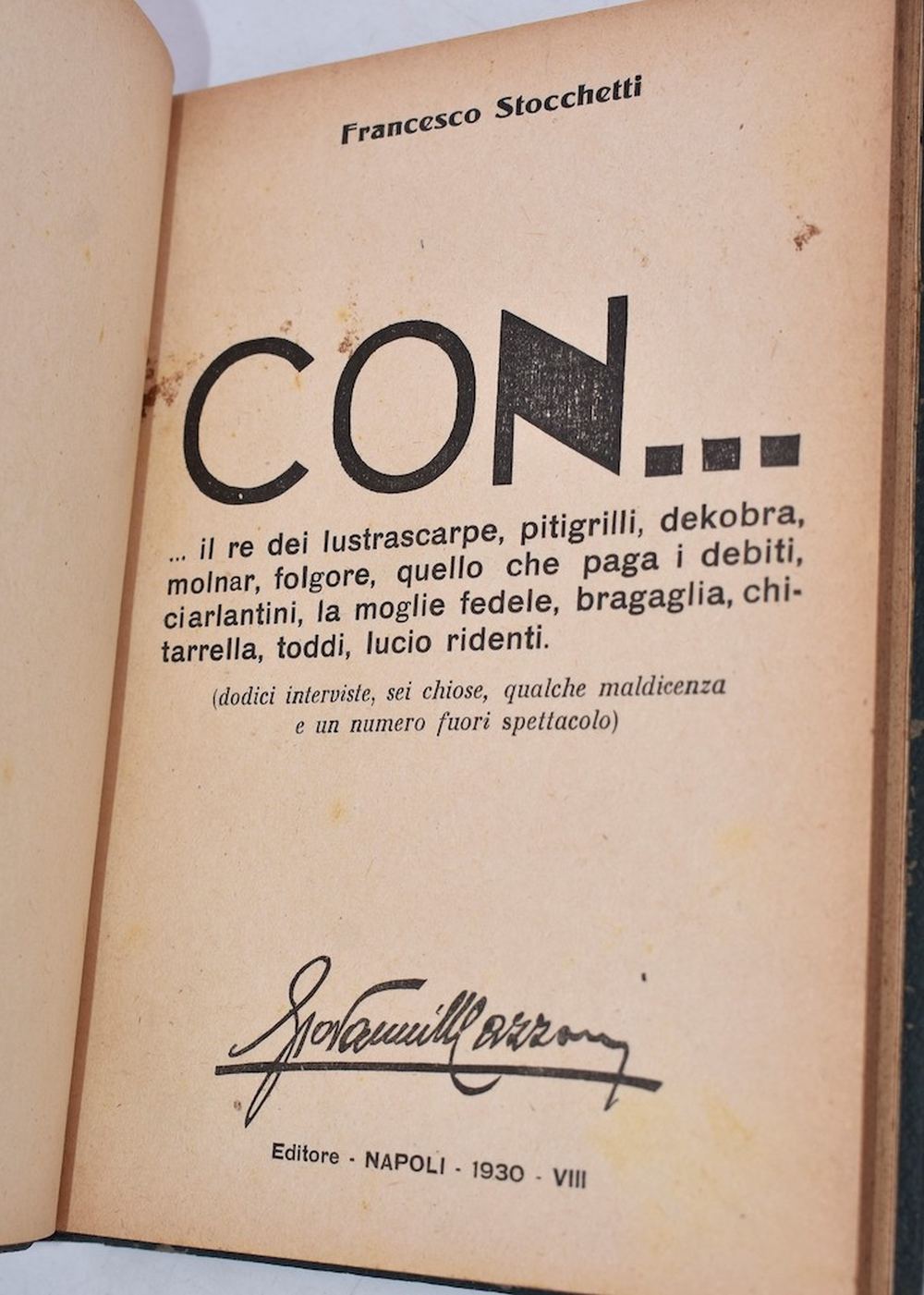 Prima edizione dell'opera del futurista Stocchetti. Dal front.: “il re dei lustrascarpe, pitigrilli, dekobra, molnar, folgore, quello che paga i debiti, ciarlantini, la moglie fedele, bragaglia, chitarrella, toddi, lucio ridenti (dodici interviste, sei chiose, qualche maldicenza e un numero fuori spettacolo)”. Legatura in piena pelle con titoli in oro al dorso.