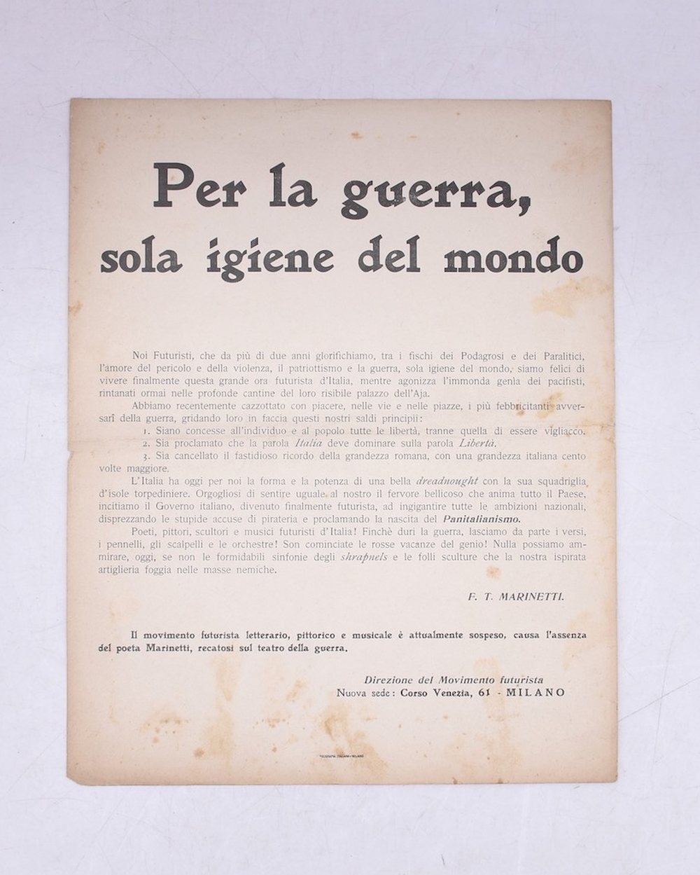 Comunicato stampa in cui F. T. Marinetti proclama la nascita del Panitalianesimo in vista della guerra di Libia e ribadisce alcuni principii fondamentali dell'azione futurista. L'opuscolo sancisce anche la sospensione delle attività del Movimento futurista per l'assenza dello stesso Marinetti, impegnato nel teatro di guerra. Raro esemplare originale dell'epoca.
