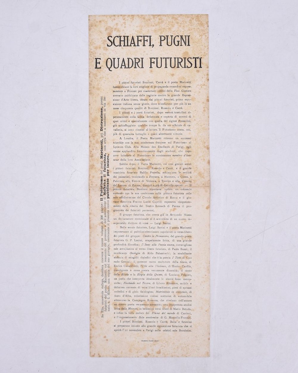 L’articolo porta abbondante acqua al mulino futurista, citando gli entusiastici riscontri del pubblico presente alle serate futuriste. Opuscolo stampato poche settimane prima della grande esposizione futurista del 1915 a Parigi nella galleria Bernheim.Forse uno dei più importanti e rappresentativi manifesti della nascita del Futurismo. L'esemplare presenta fioriture sparse.