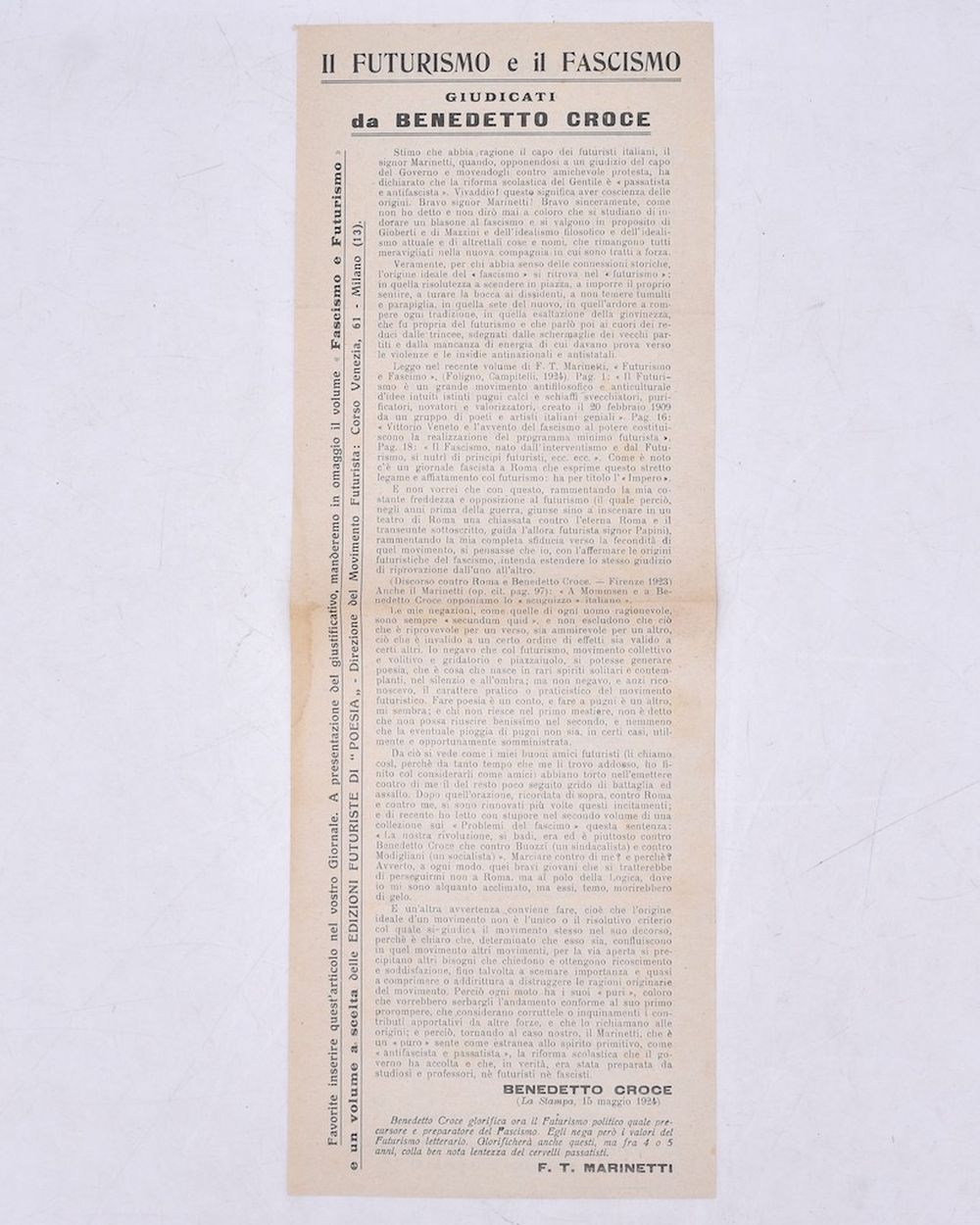 Comunicato stampa con un articolo di Croce (La Stampa, 15 Maggio 1924) con suo intervento critico sui principi del manifesto futurista e sull'opera di Marinetti "Il Futurismo e il Fascismo" (1924). In calce al testo, una arguta replica del diretto interessato. Si dispone di 2 esemplari originali, ripiegati al centro.