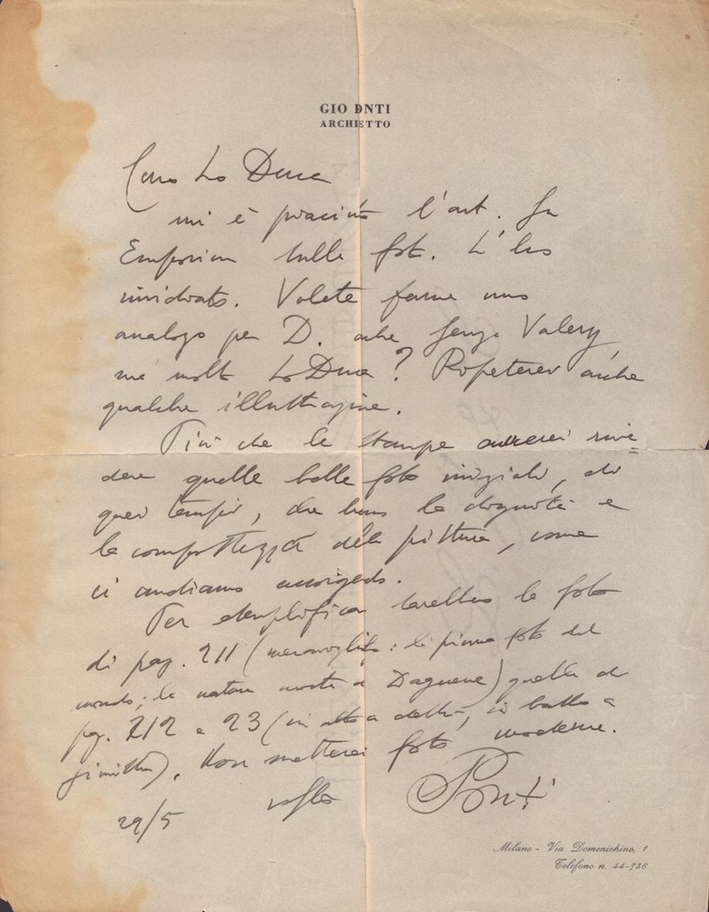 ( ma 1939 come si evince dal contenuto ) indirizzata allo scrittore e critico Giuseppe Maria Lo Duca ( 1910-2004) nella quale gli propone di pubblicare un articolo sulla rivista Domus dopo averne letto uno di Suo gradimento "La Fotografia ha cent'anni" 1 p. in-4 ( 28x22 cm ca.) alone d'umido al margine sx, segno di pìega al centro del foglio.
