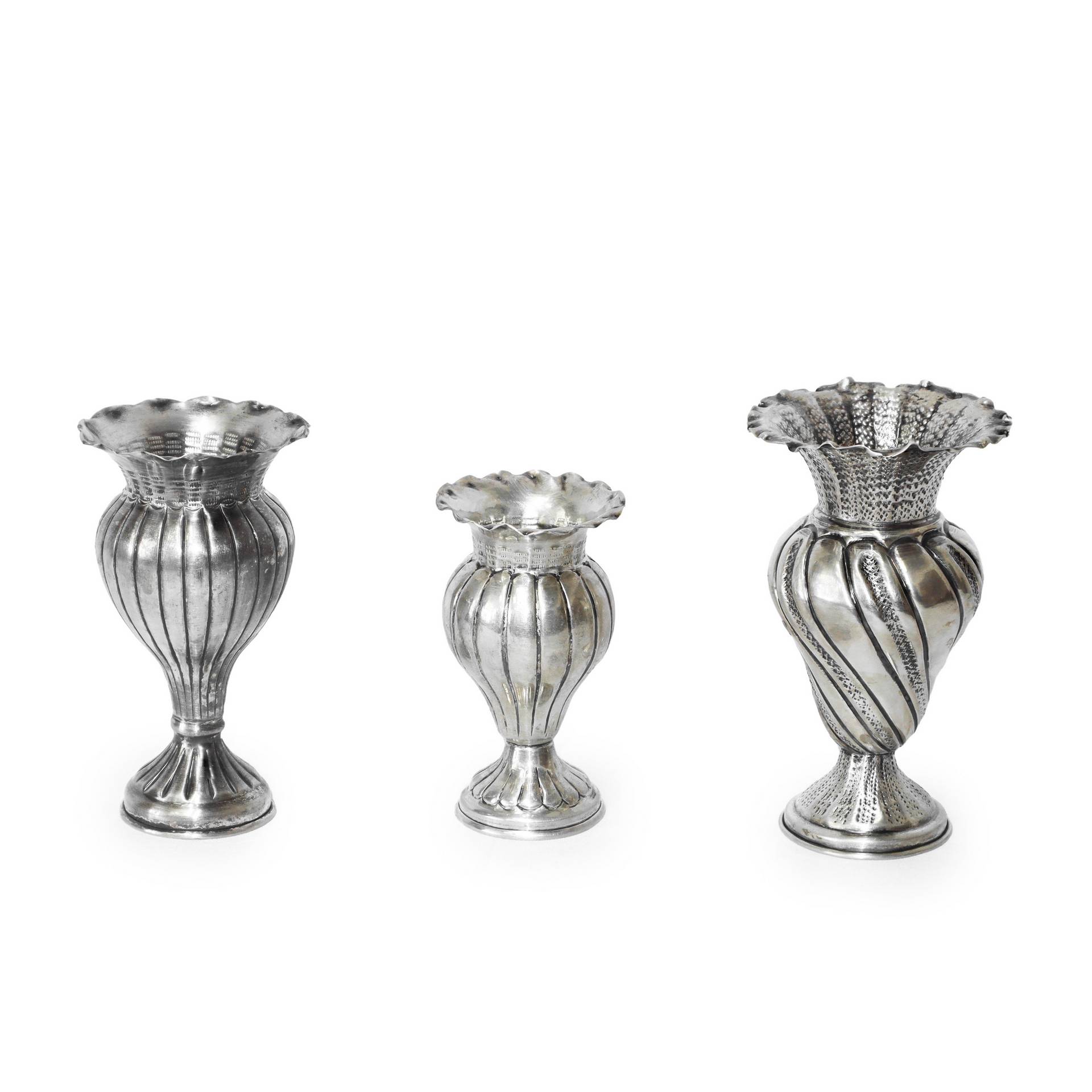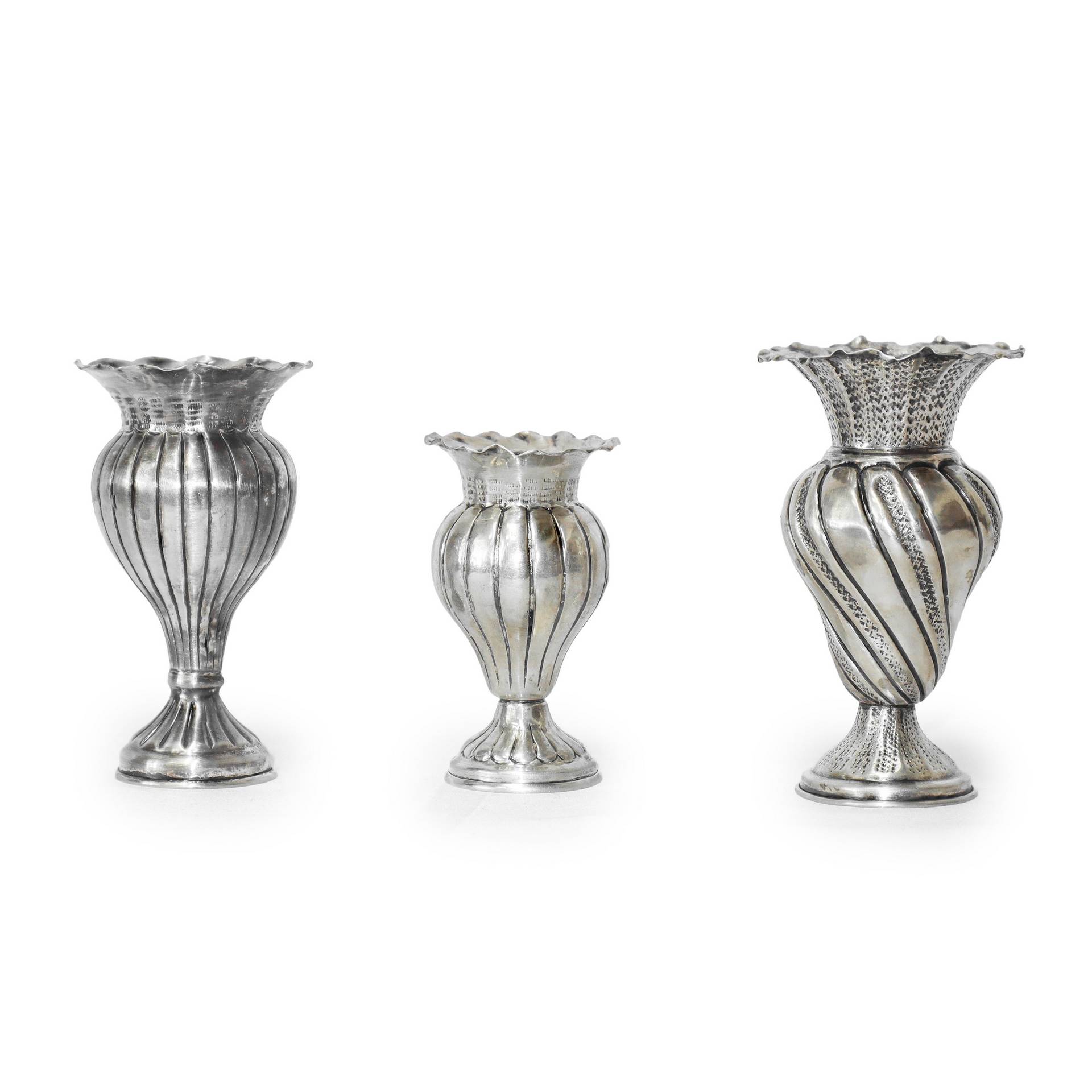 3 vasetti in argento di misure diverse, sbalzati e cesellati., primi 1900s