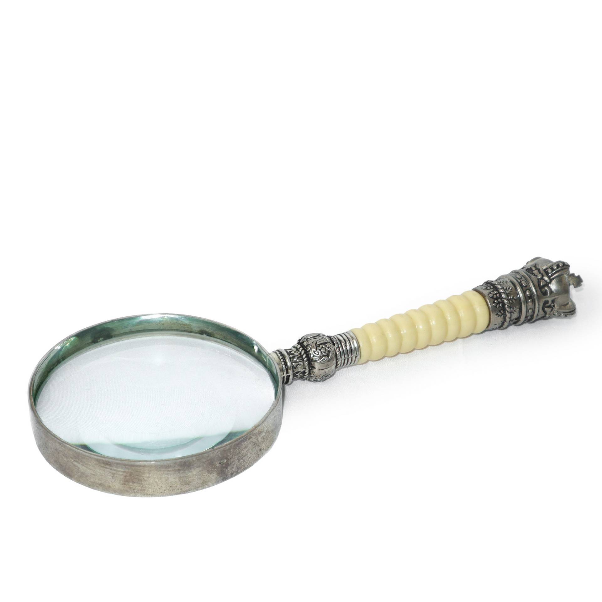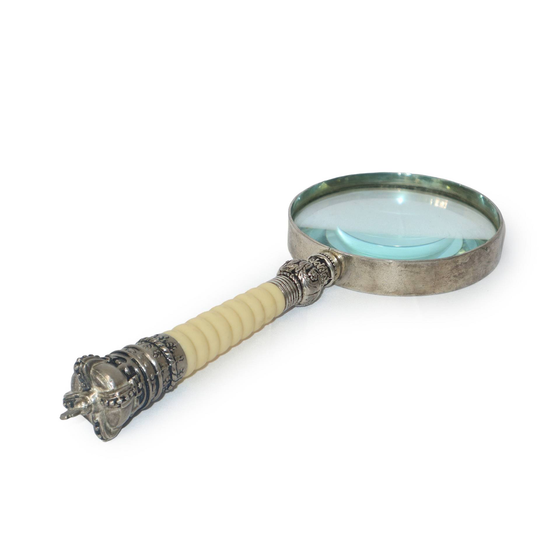 Lente di ingrandimento con manico in osso e estremità a forma di corona in argento, primi 20° secolo