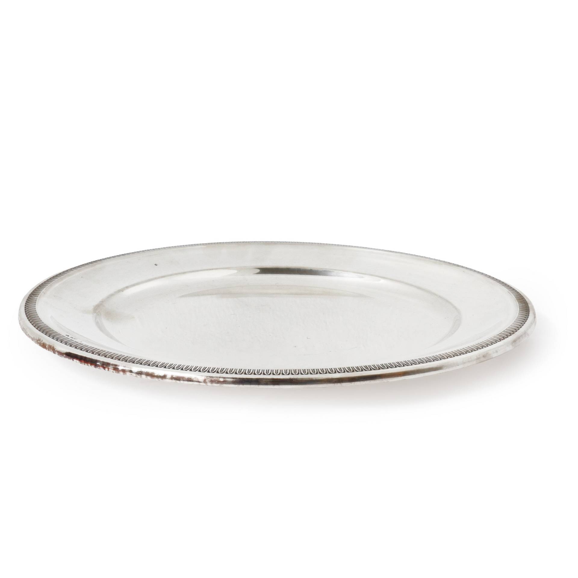 Vassoio rotondo con bordo bulinato e lanceolato