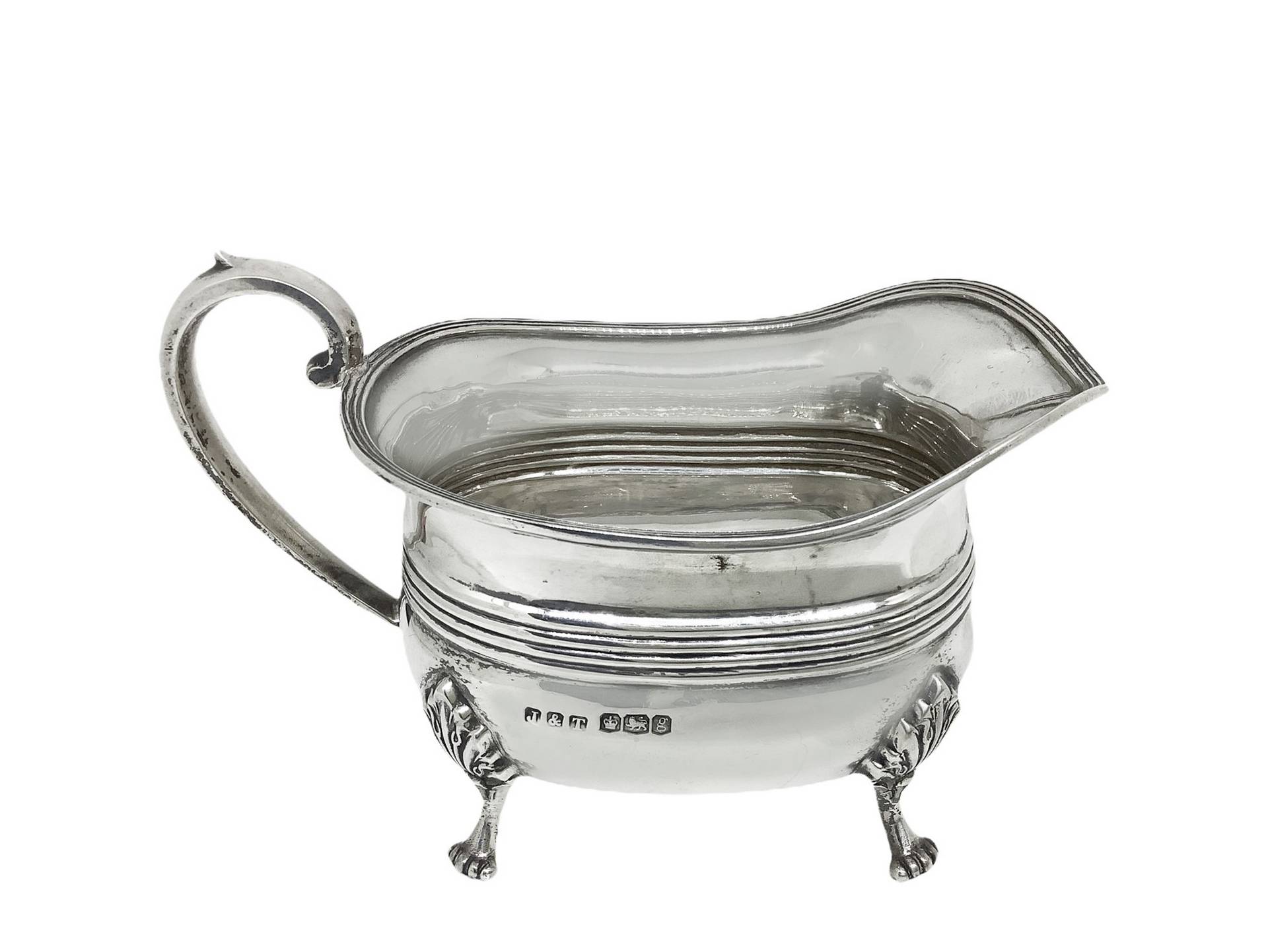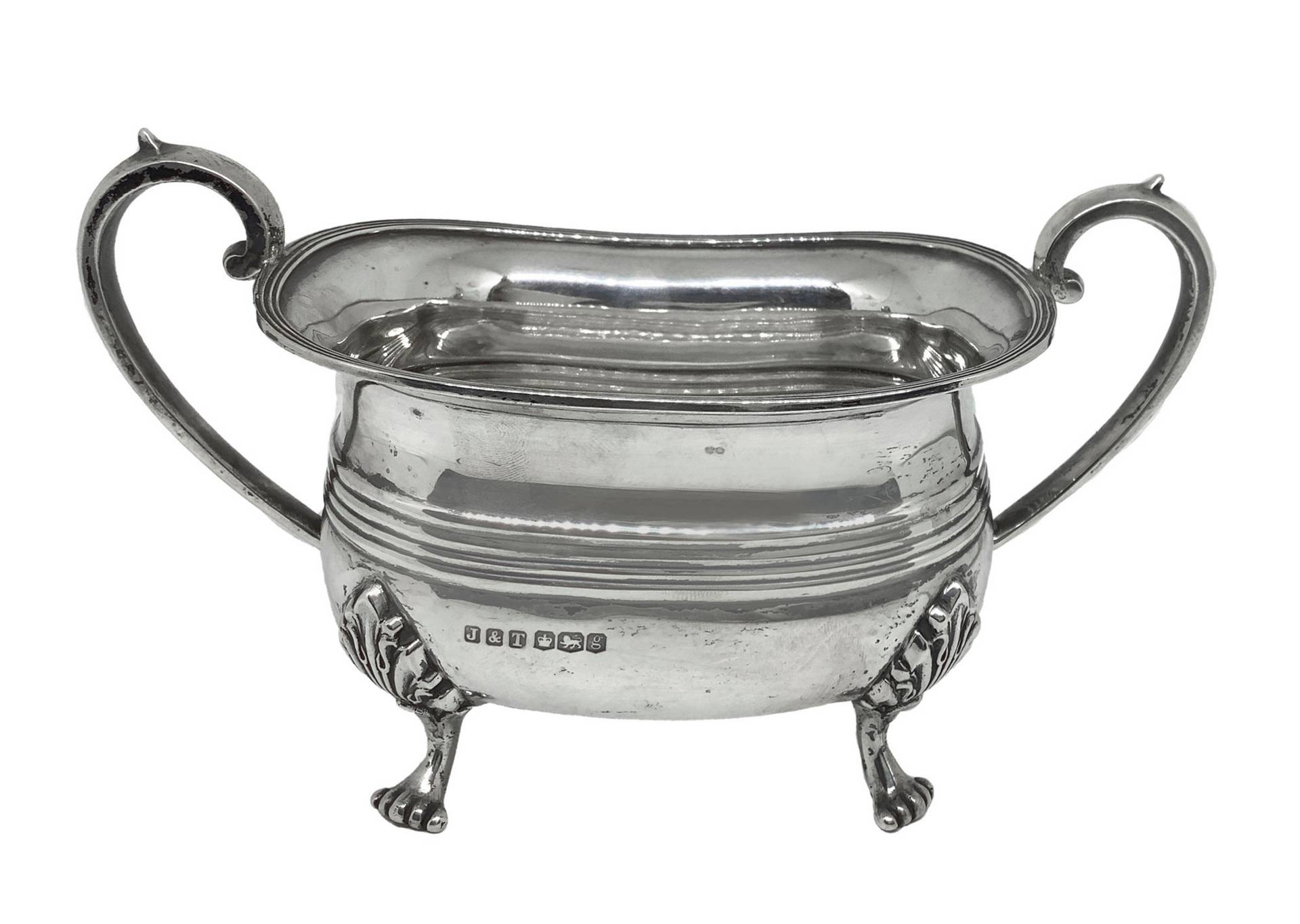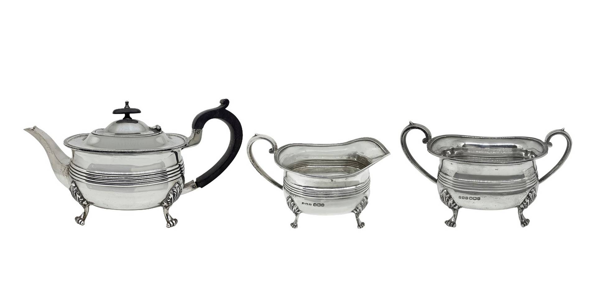 Gruppo composto da n.3 pezzi in argento Sterling 925: teiera, lattiera e zuccheriera teiera h 14x27; zuccheriera cm, 8x18 cm, lattiera 7x15 cm. Kg 1340 Produzione della Città di Sheffield, anno 1924, punzone argentieri J&TProduzione della Città di Sheffield, anno 1924, punzone argentieri J&T