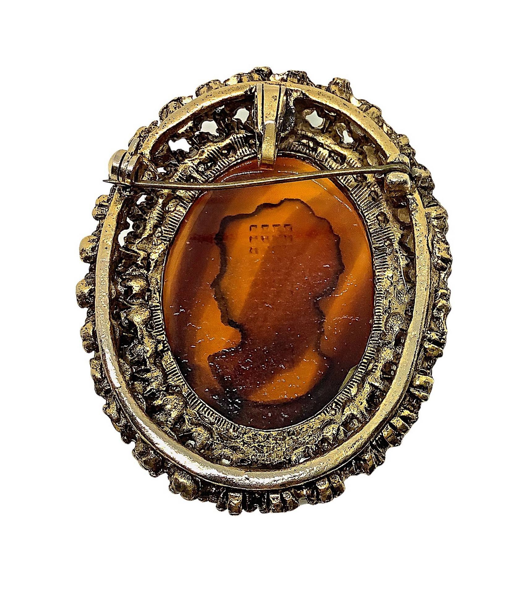 Spilla a pendentif con cammeo, 20° secolo 34,2 gr Lavorazione in pasta di vetro raffigurante volto di donna, contornata da piccole perline e pietre nereLavorazione in pasta di vetro raffigurante volto di donna, contornata da piccole perline e pietre nere