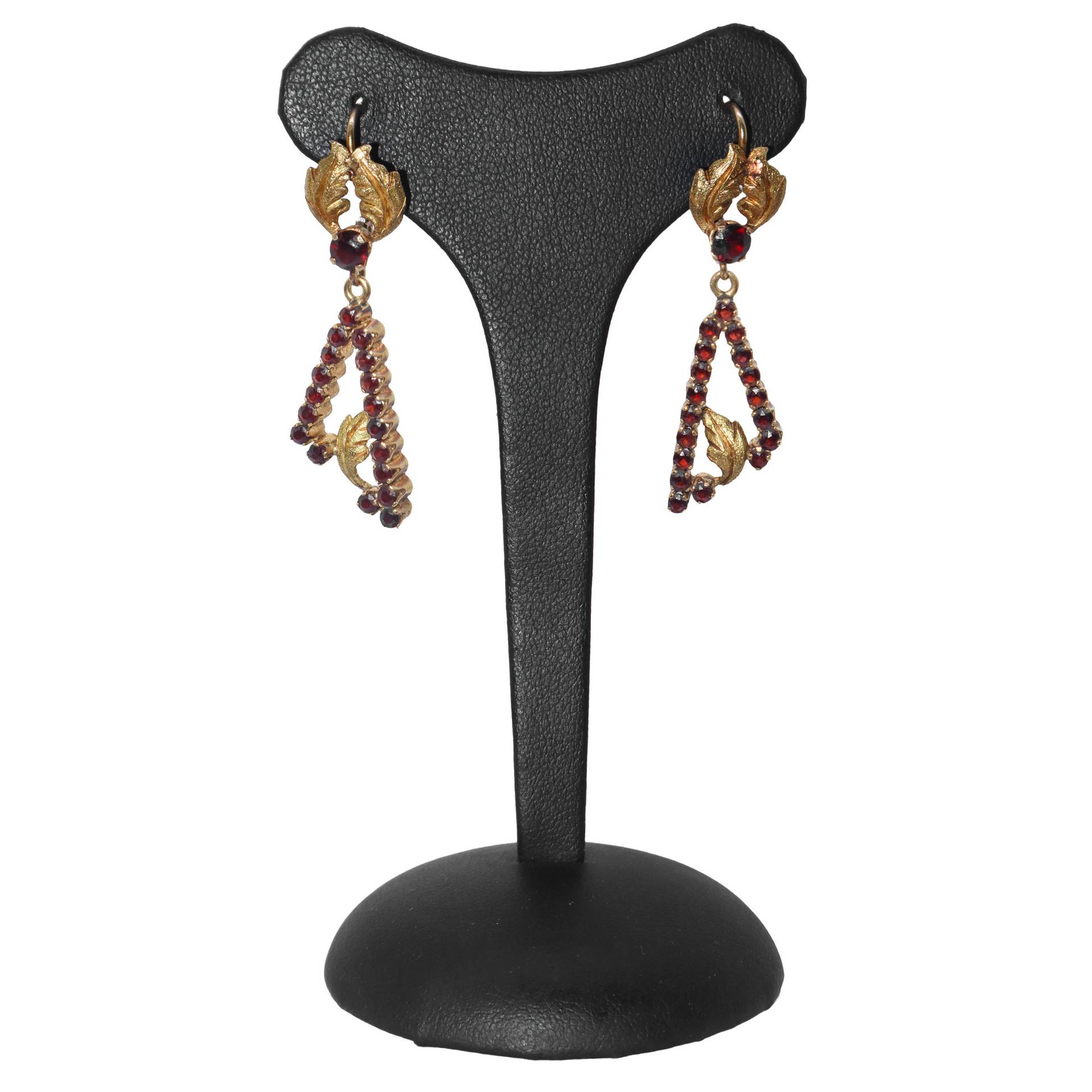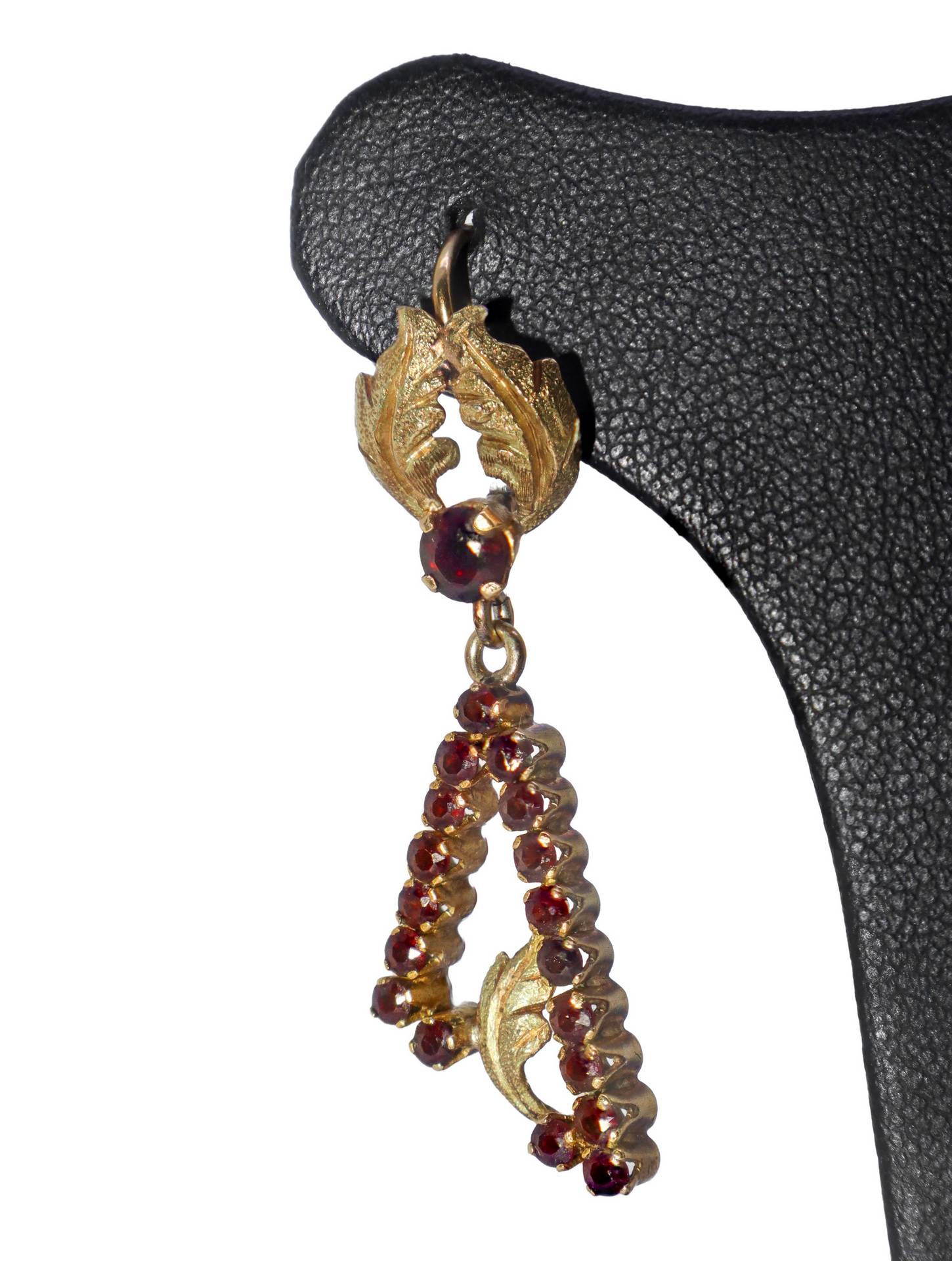 Orecchini in oro 18 con foglie ceselfine e triangoli di granati, 60's