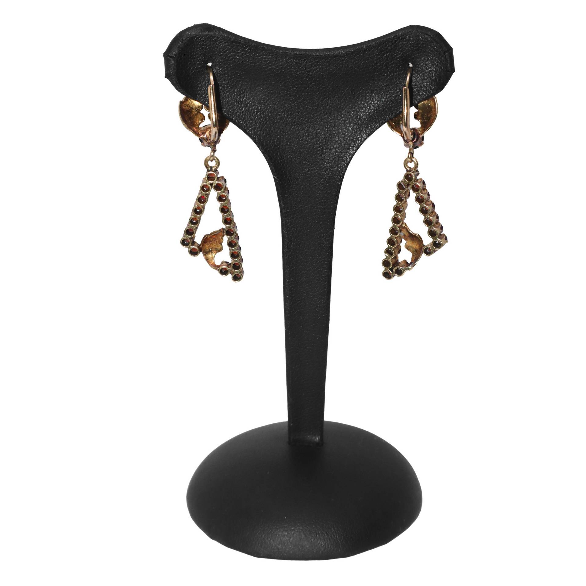 Orecchini in oro 18 con foglie ceselfine e triangoli di granati, 60's 9 gr - cm 4.1