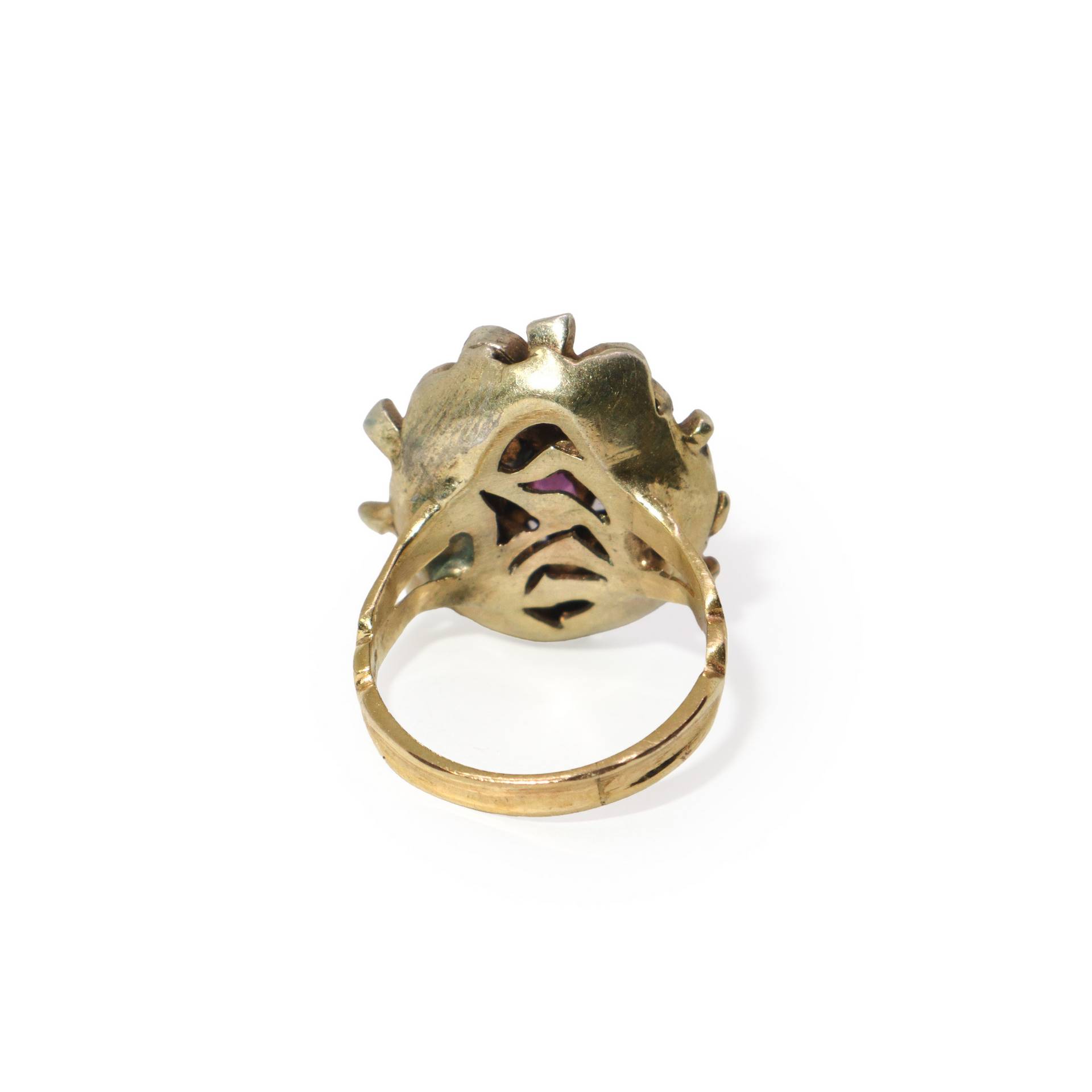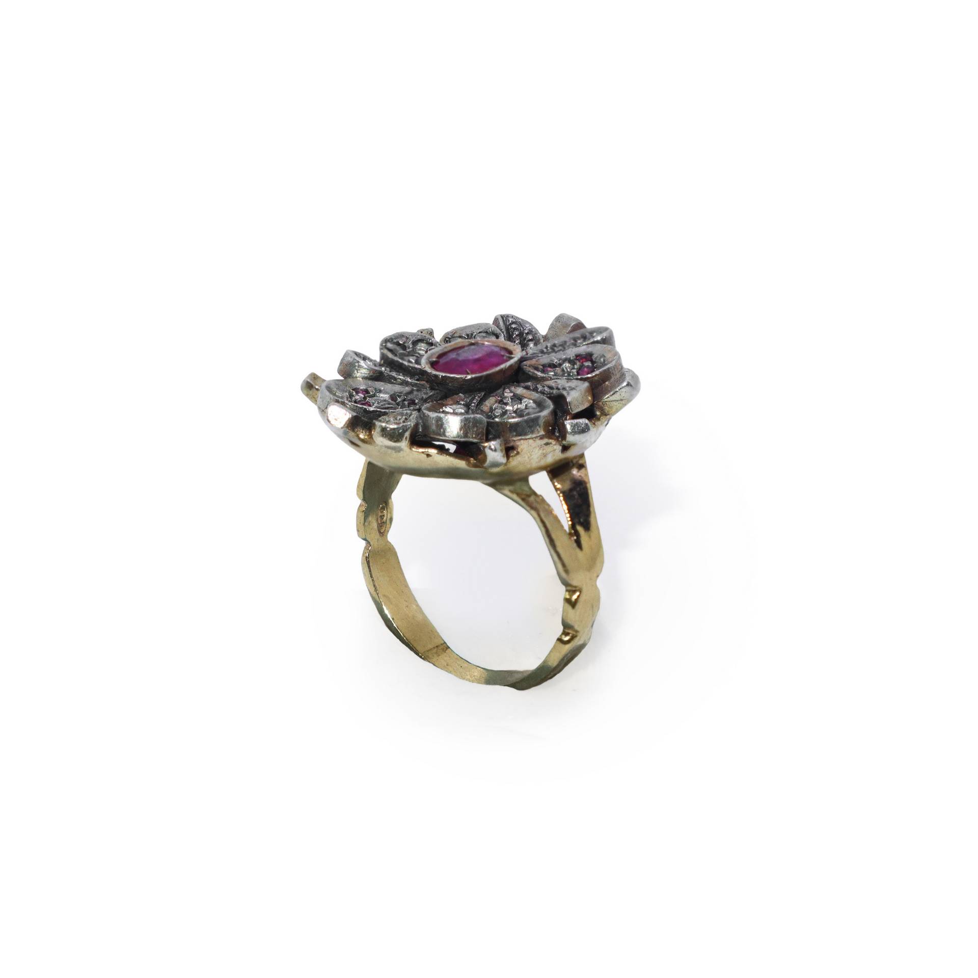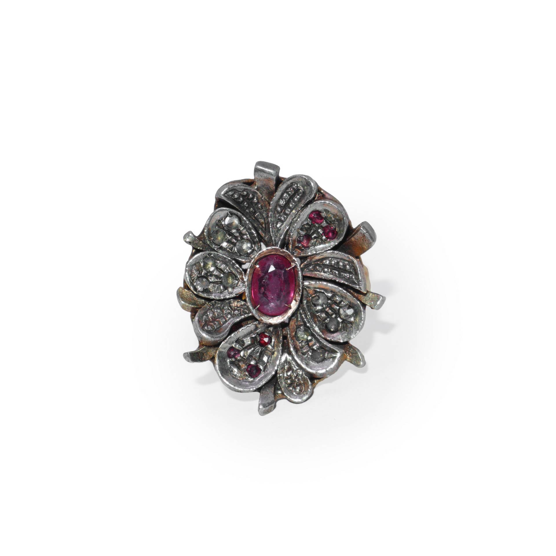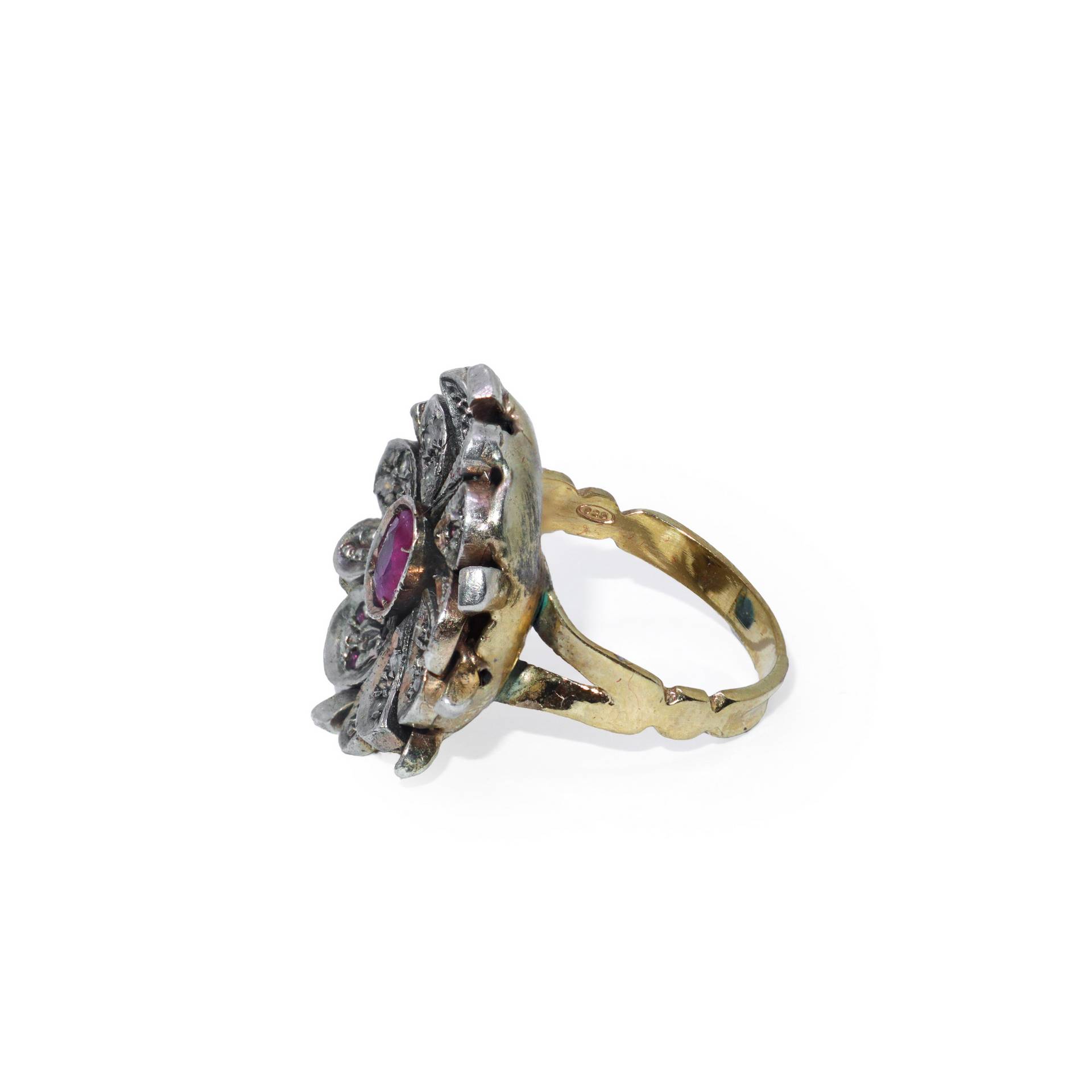 Anello in oro e coppella convesso con rubino centrale circondato da diamanti 8,2 gr