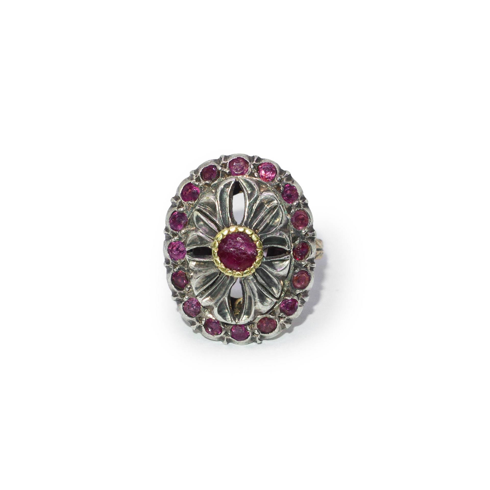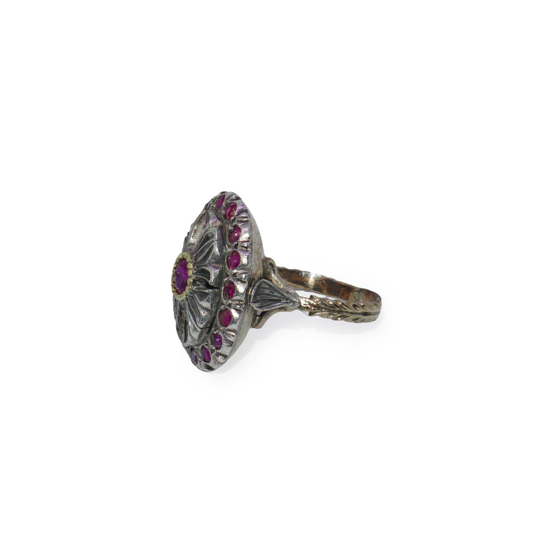 Anello a toppa ovale in oro e coppella con rubino rotondo centrale contornato da piccolo rubini, Sicily, 1930s. 8,2 gr - cm 2.3x1.9