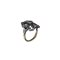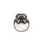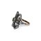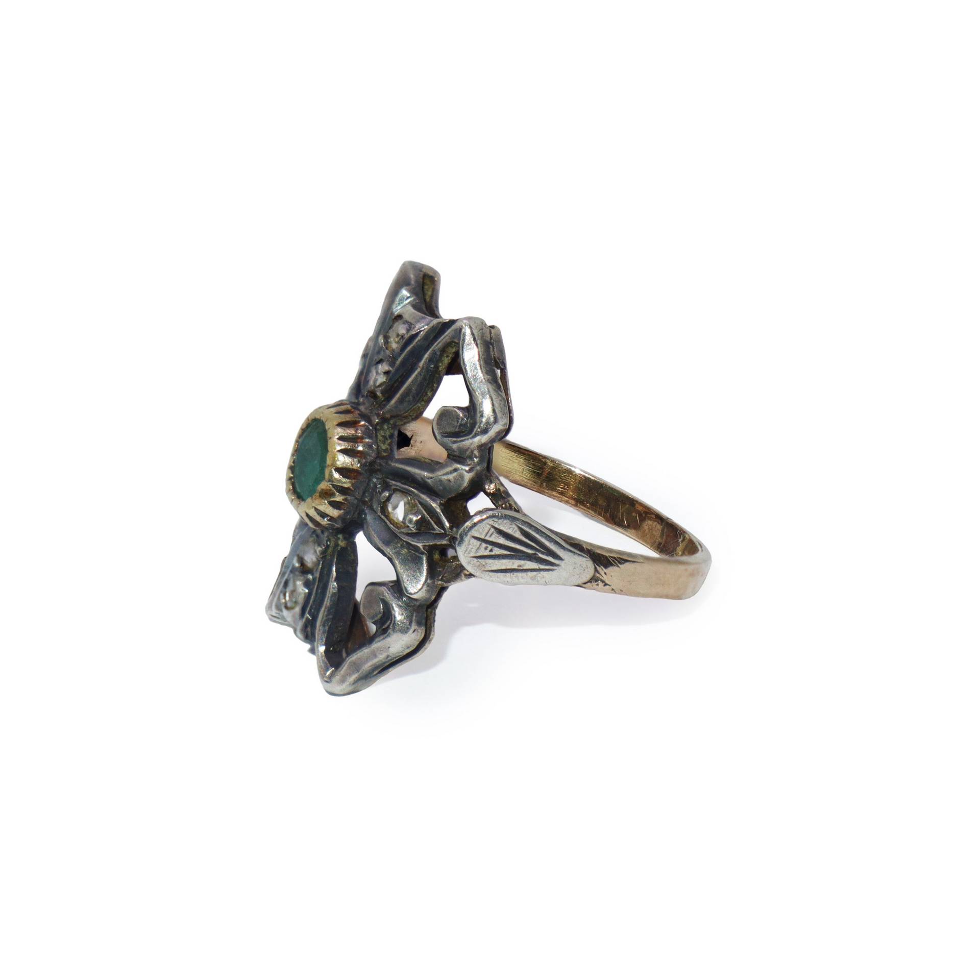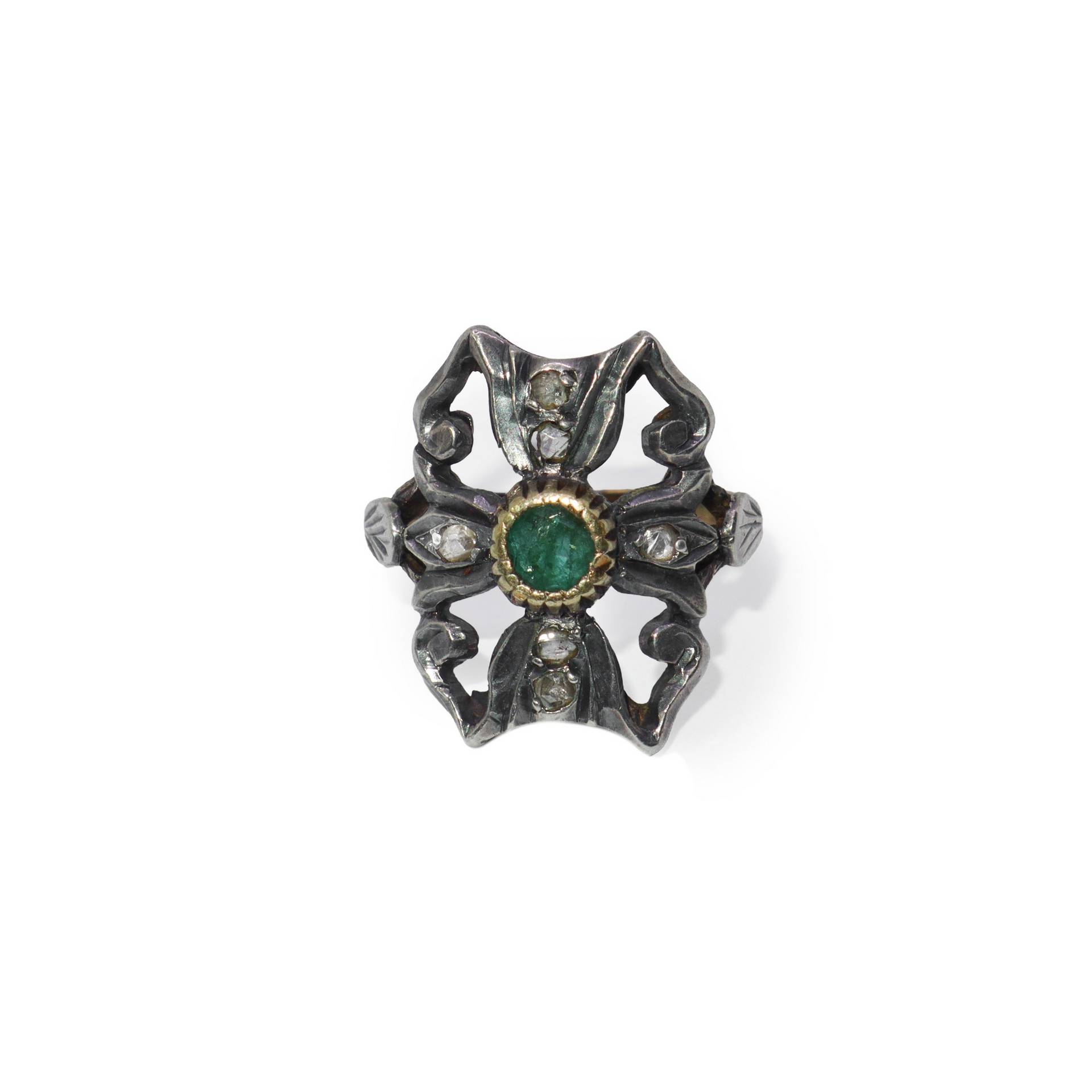 Anello in stile antico in oro e coppella a farfalla con smeraldo rotondo central e diamantine