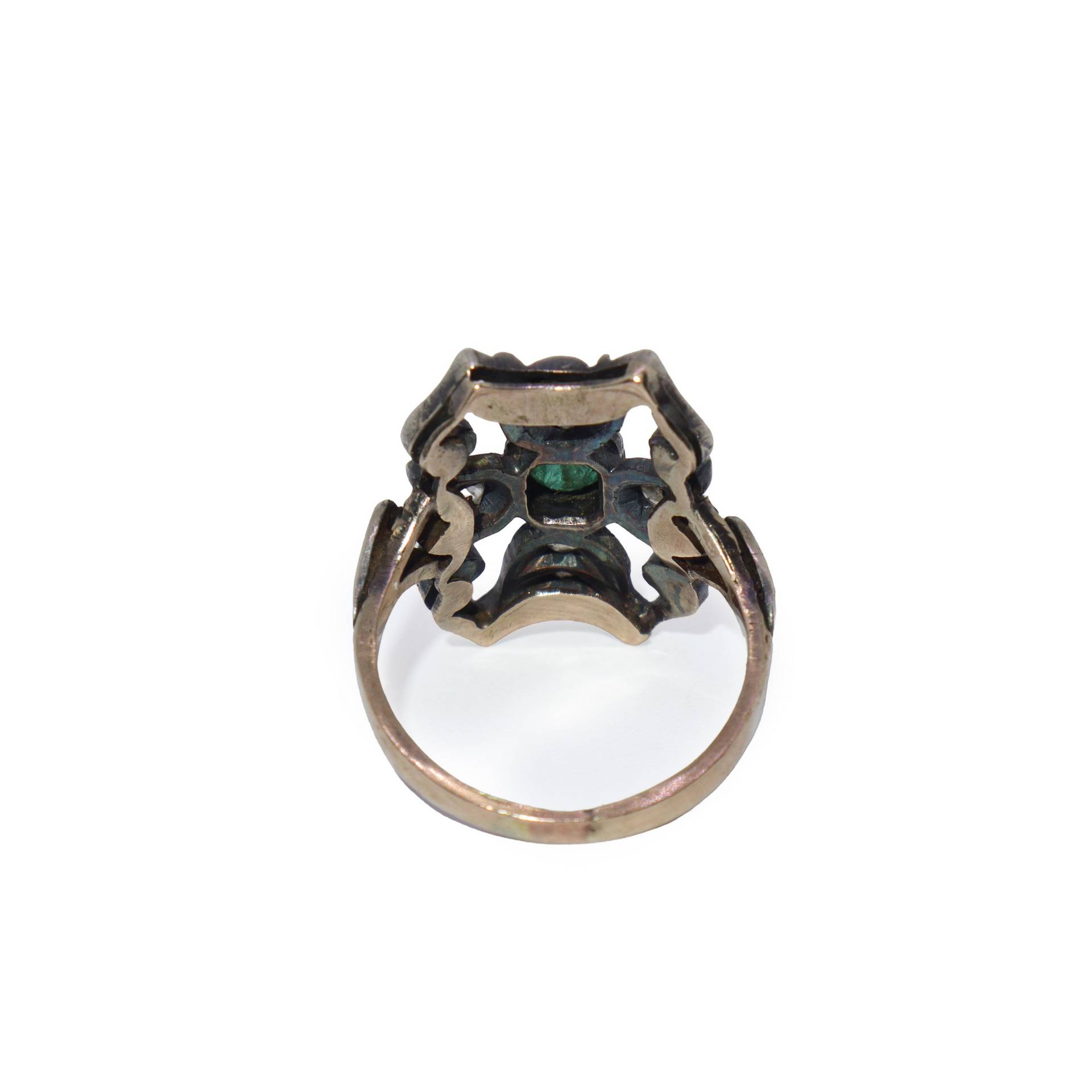 Anello in stile antico in oro e coppella a farfalla con smeraldo rotondo central e diamantine 5,6 gr - cm 2.1x2