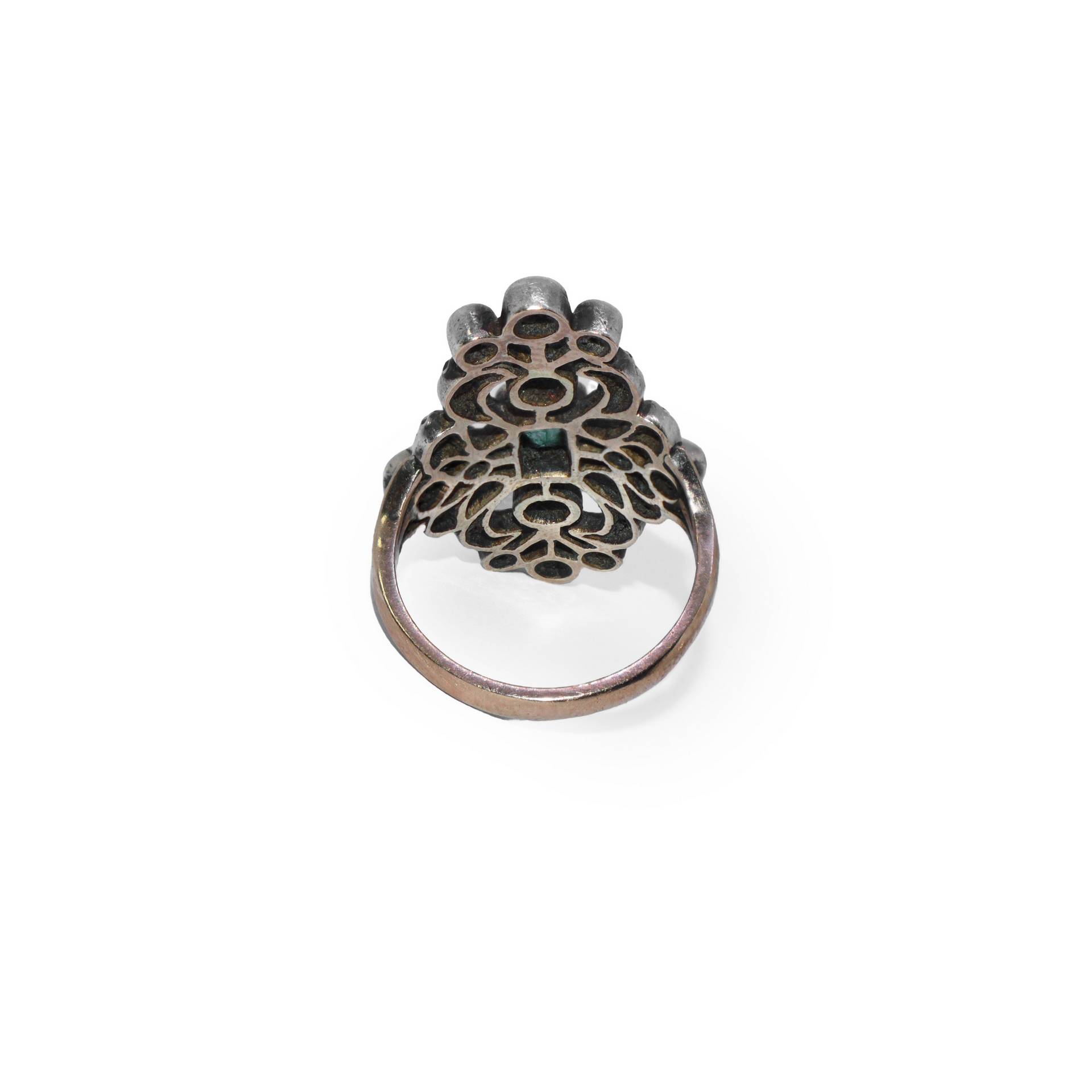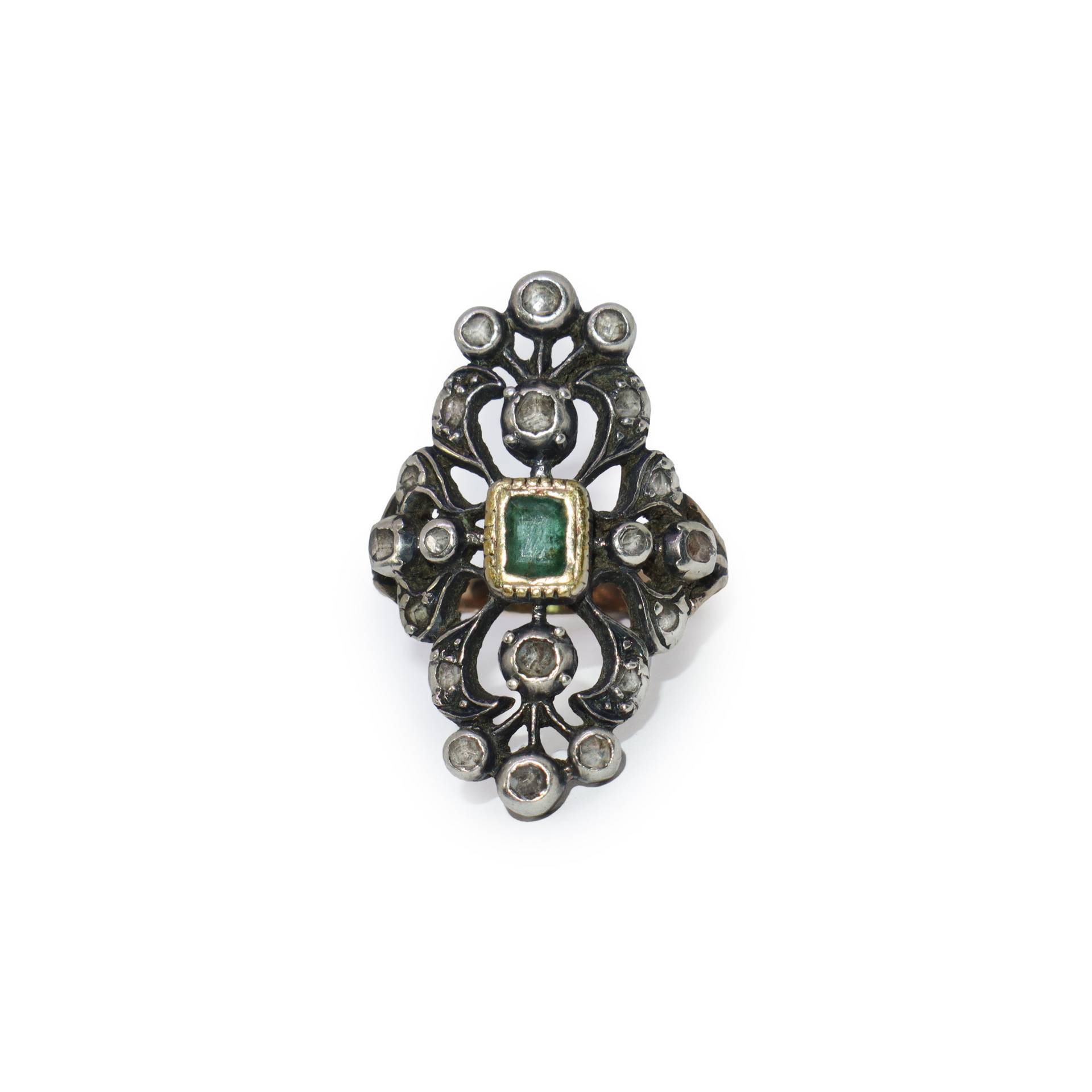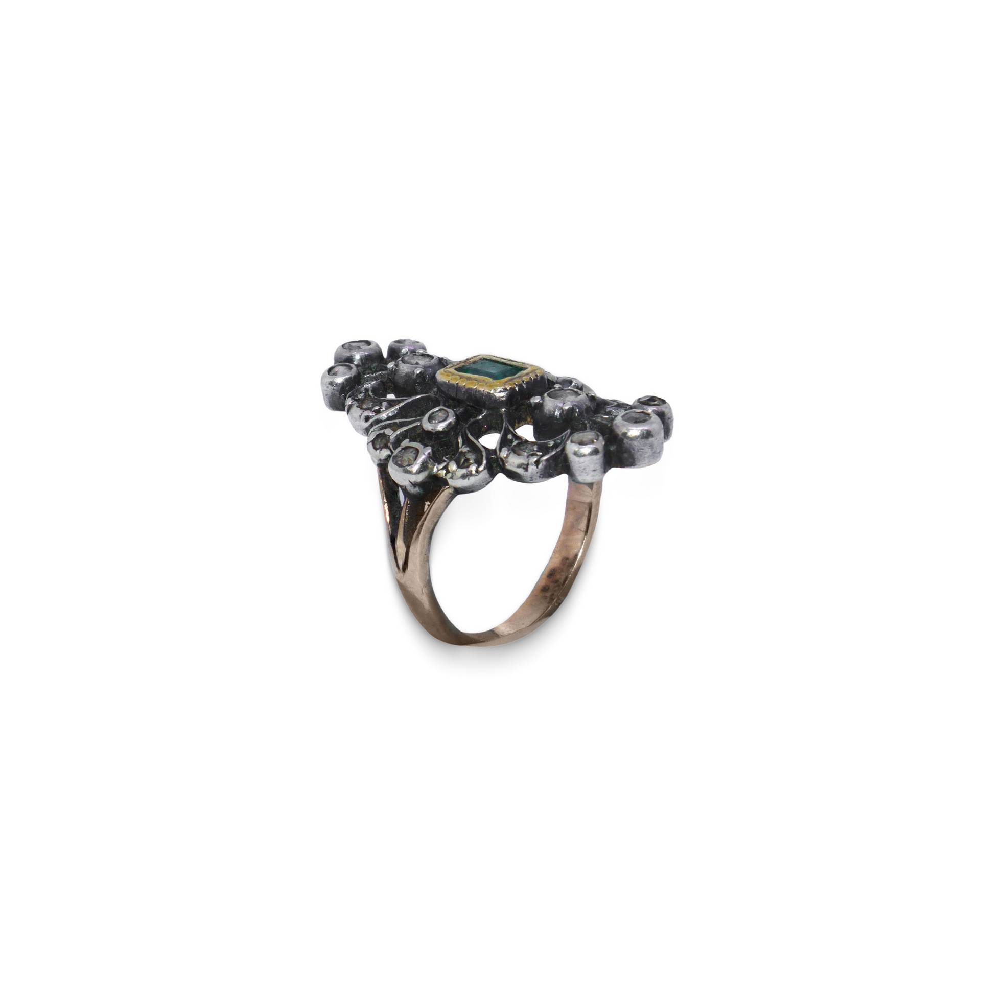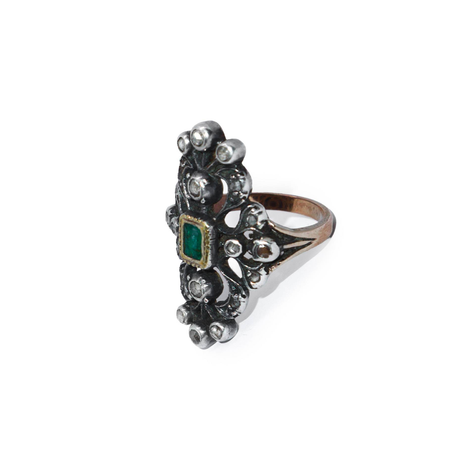 Anello in oro e coppella con smeraldo rettangolare contornato da rosette, Sicily, 1930s. 7,5 gr - cm 2.9x2