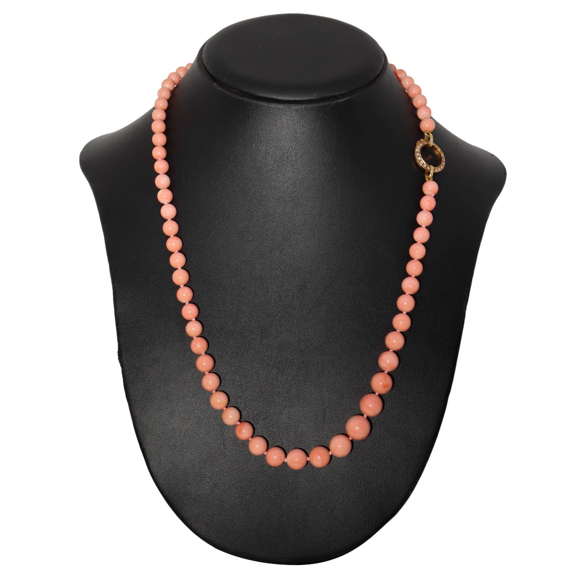 Collana in corallo rosa a degradare con susta laterale in oro giallo e brillanti cm 60