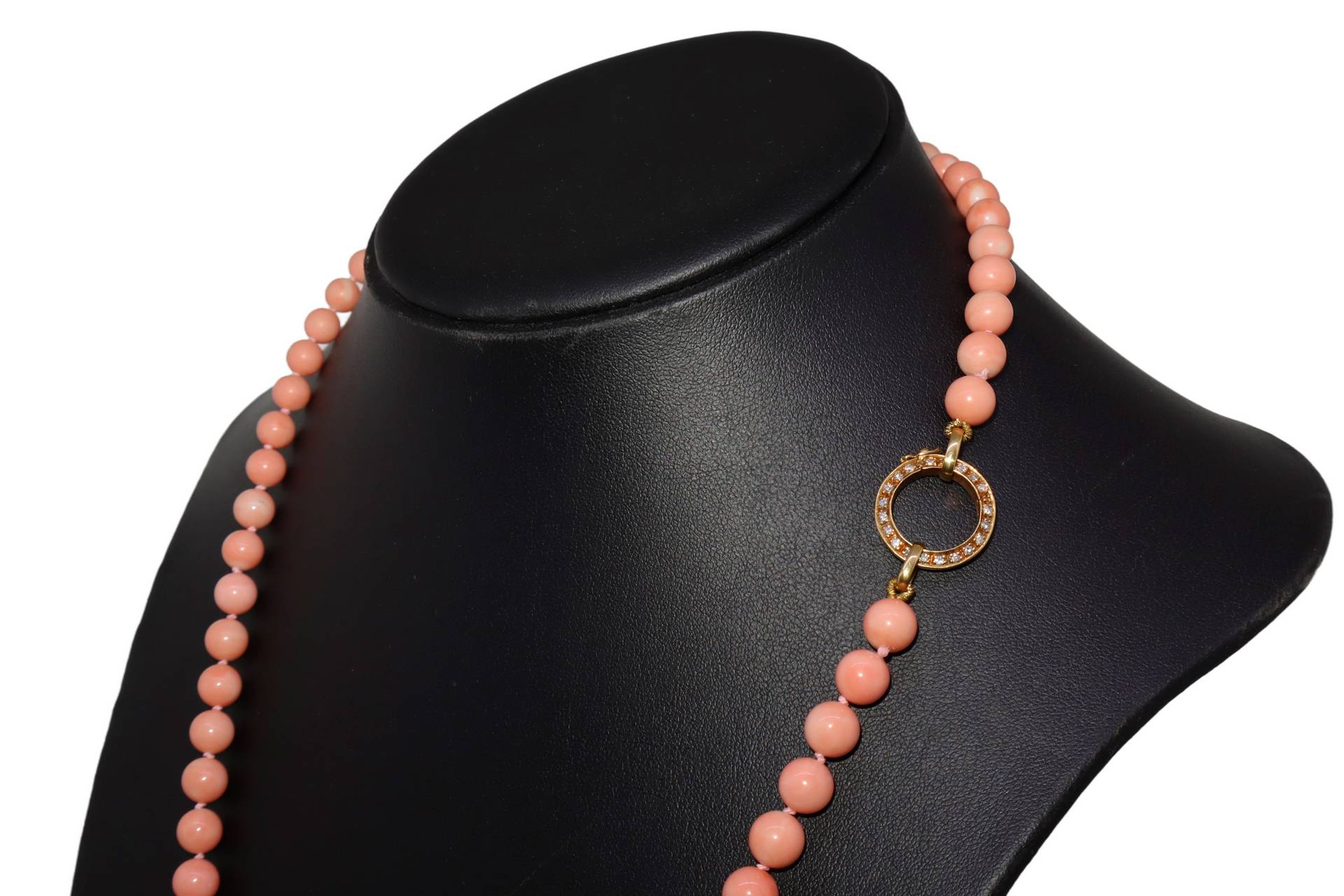 Collana in corallo rosa a degradare con susta laterale in oro giallo e brillanti