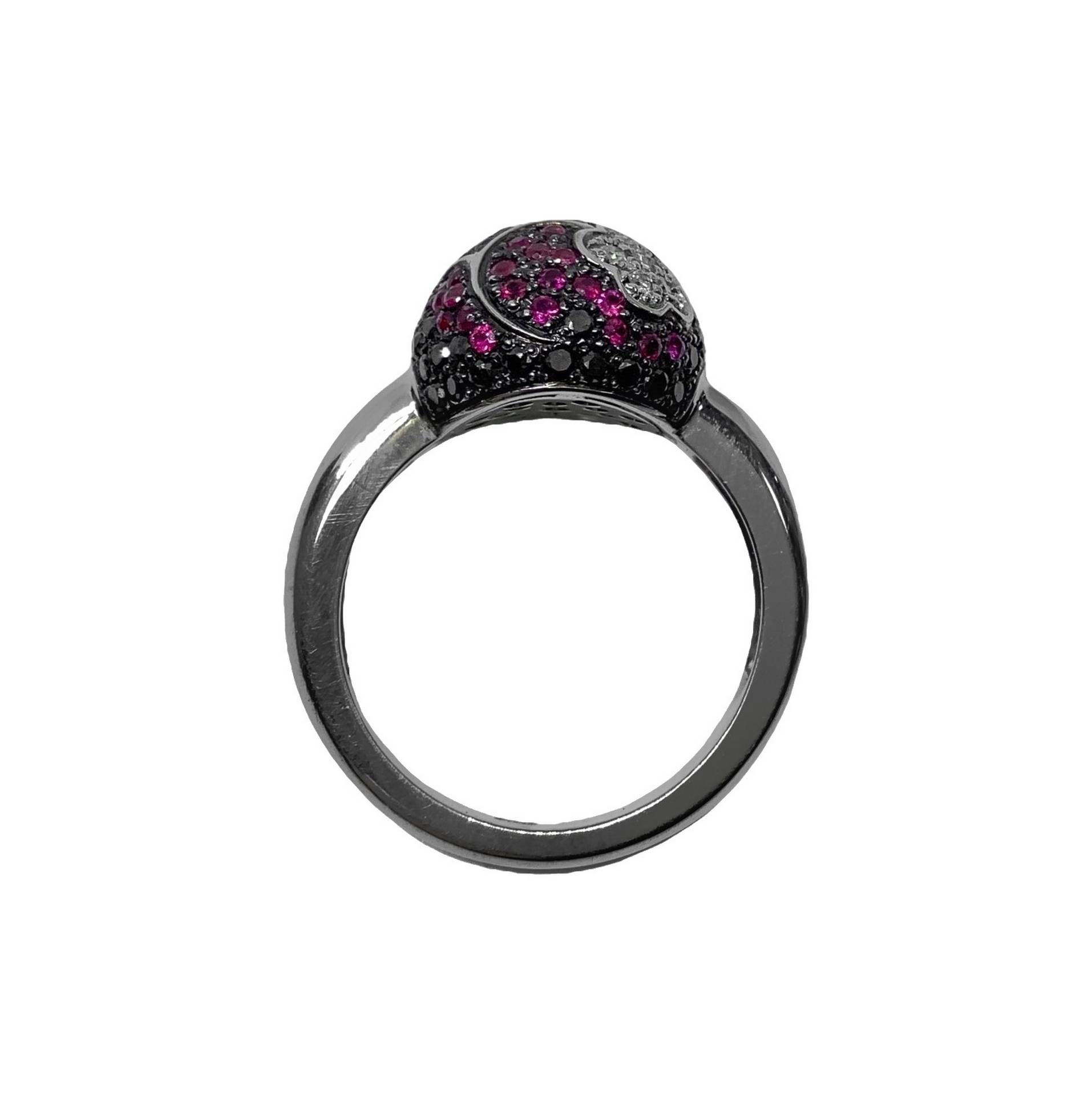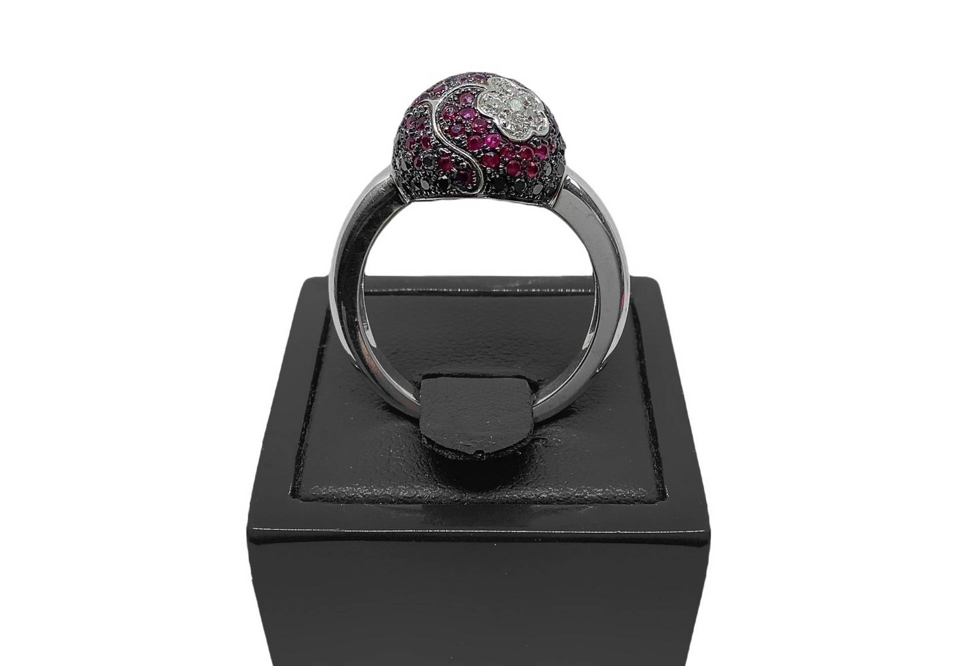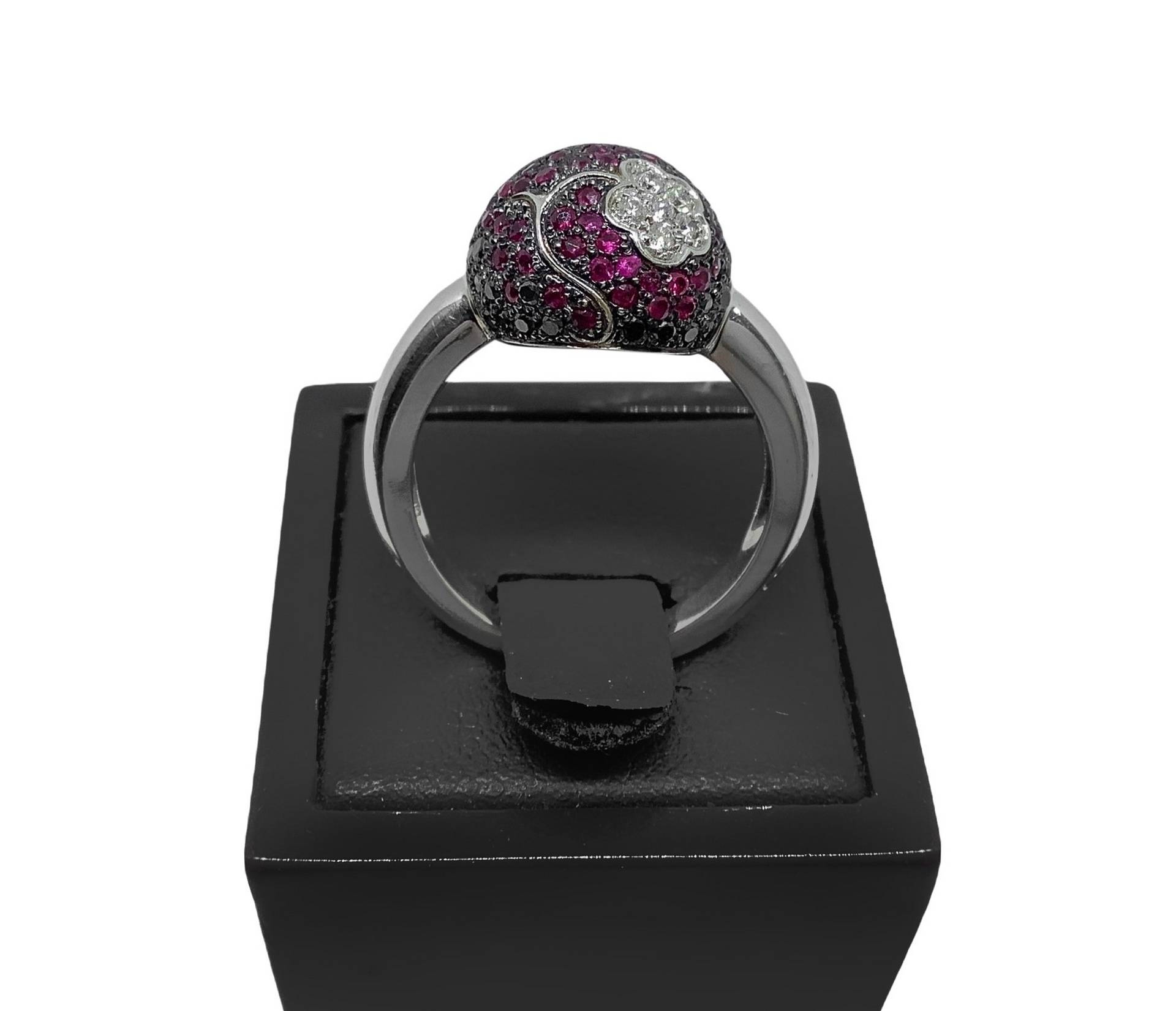 Anello Flower, in oro con diamanti, diamanti neri e rubini misura cm 13 Diamanti ct 0,19, diamanti neri ct 0,34, rubini ct 0,59Diamanti ct 0,19, diamanti neri ct 0,34, rubini ct 0,59