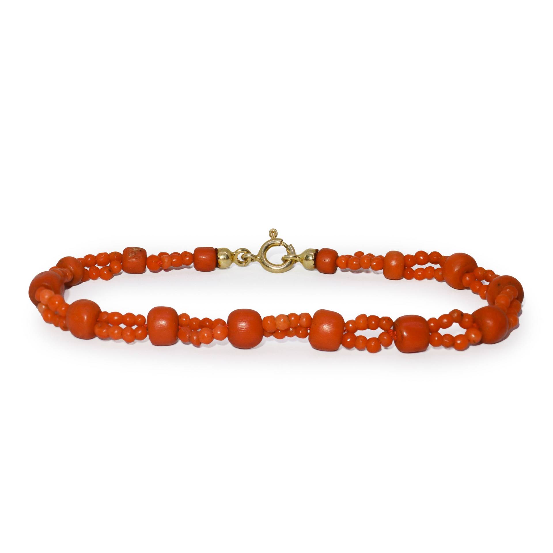 BRACCIALE IN CORALLO CON SFERE IN CORALLO INTERVALfine CON MICROPERLINE, SUSTA IN ARGENTO DORATO, NINETEEN° secolo