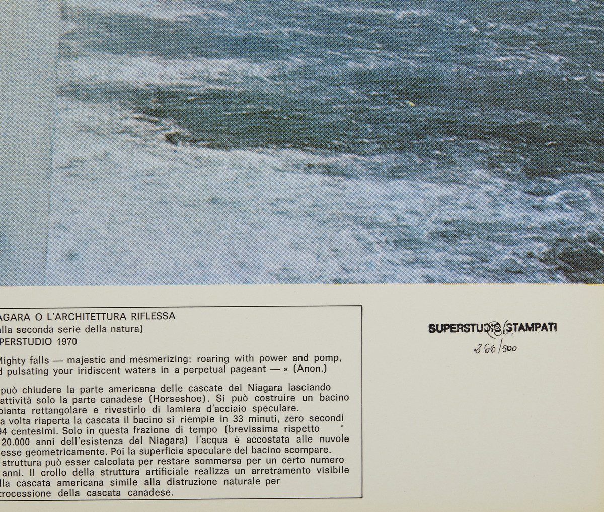 SUPERSTUDIO NIAGARA, 1970. Litografia offset su carta patinata. Cm 87,00 x 69,00. tiratura e firma A. Natalini a pennarello, es. 260/500.
