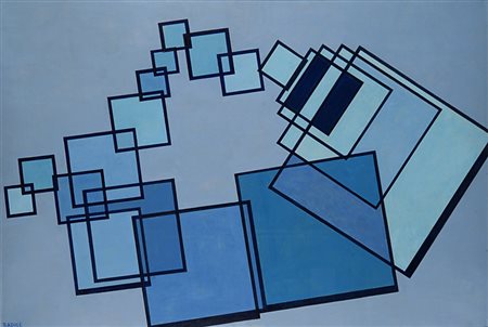 Mario Radice , Como 1898 , 1987 "P.R.O.G.19Q" 1973 olio su cartone, cm 66x99 Firmato in basso a sinistra. Firmato, titolato e datato 1973 al retro L'opera è accompagnata da certificato di autenticità su fotografia rilasciato da Luciano Cramel in data 25 febbraio 2014