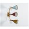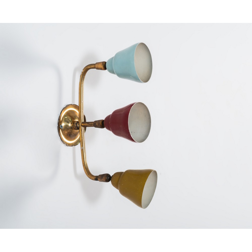 Lampada da parete-soffitto a tre luci con struttura in tubolare di metallo dorato, diffusori conici orientabili in alluminio verniciato giallo, rosso e celeste. Lievi ossidazioni.