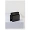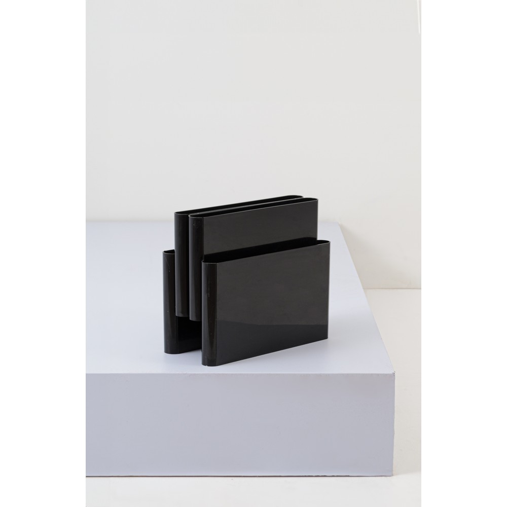 Portariviste in materiale plastico nero, corpo a degradare con vani contenitori. Marchio di produzione.