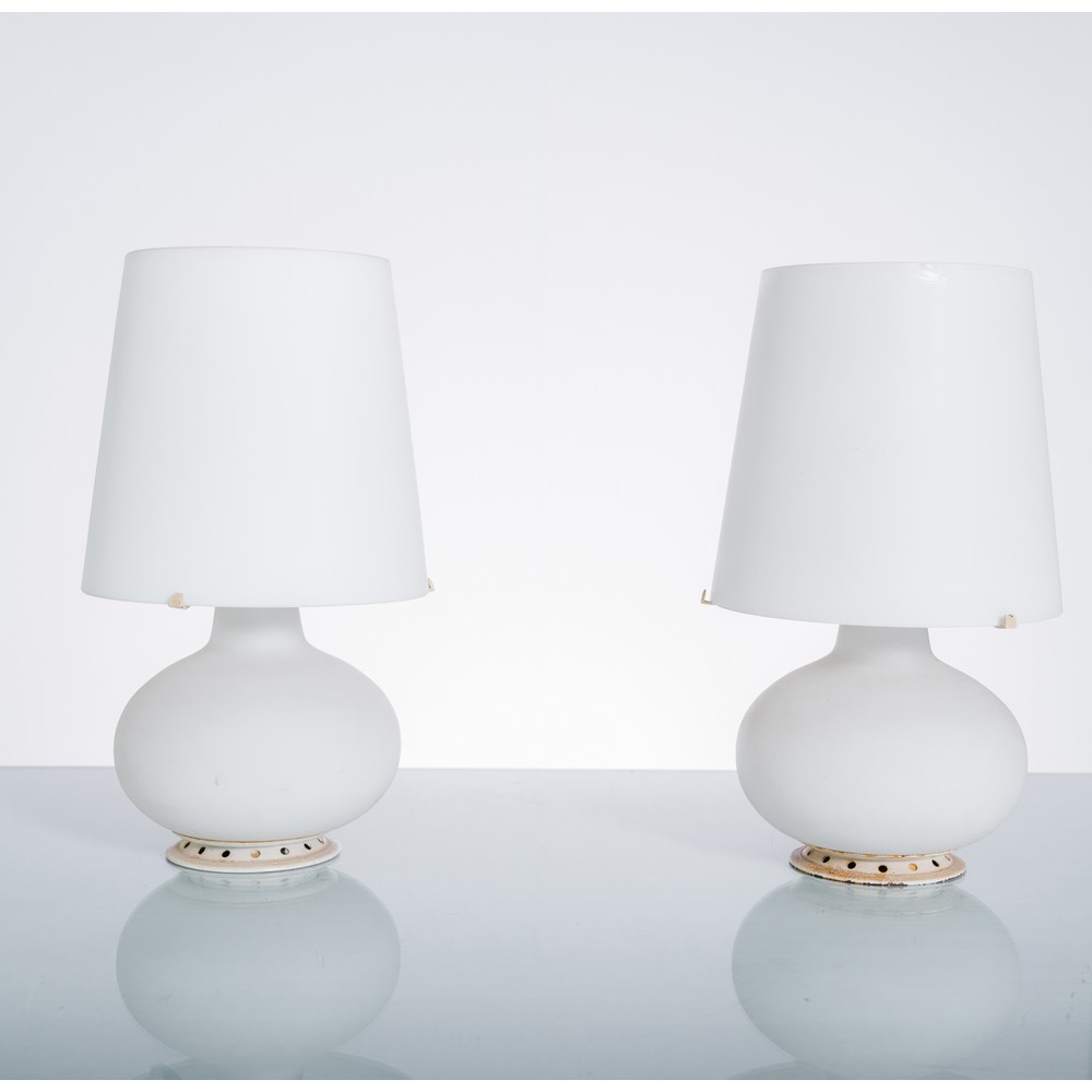 Coppia di lampade da tavolo ad una luce modello “1853” piccolo, corpo sferico e diffusore conico in vetro satinato. Supporto in metallo laccato bianco. Sbeccature ai diffusori.
