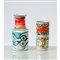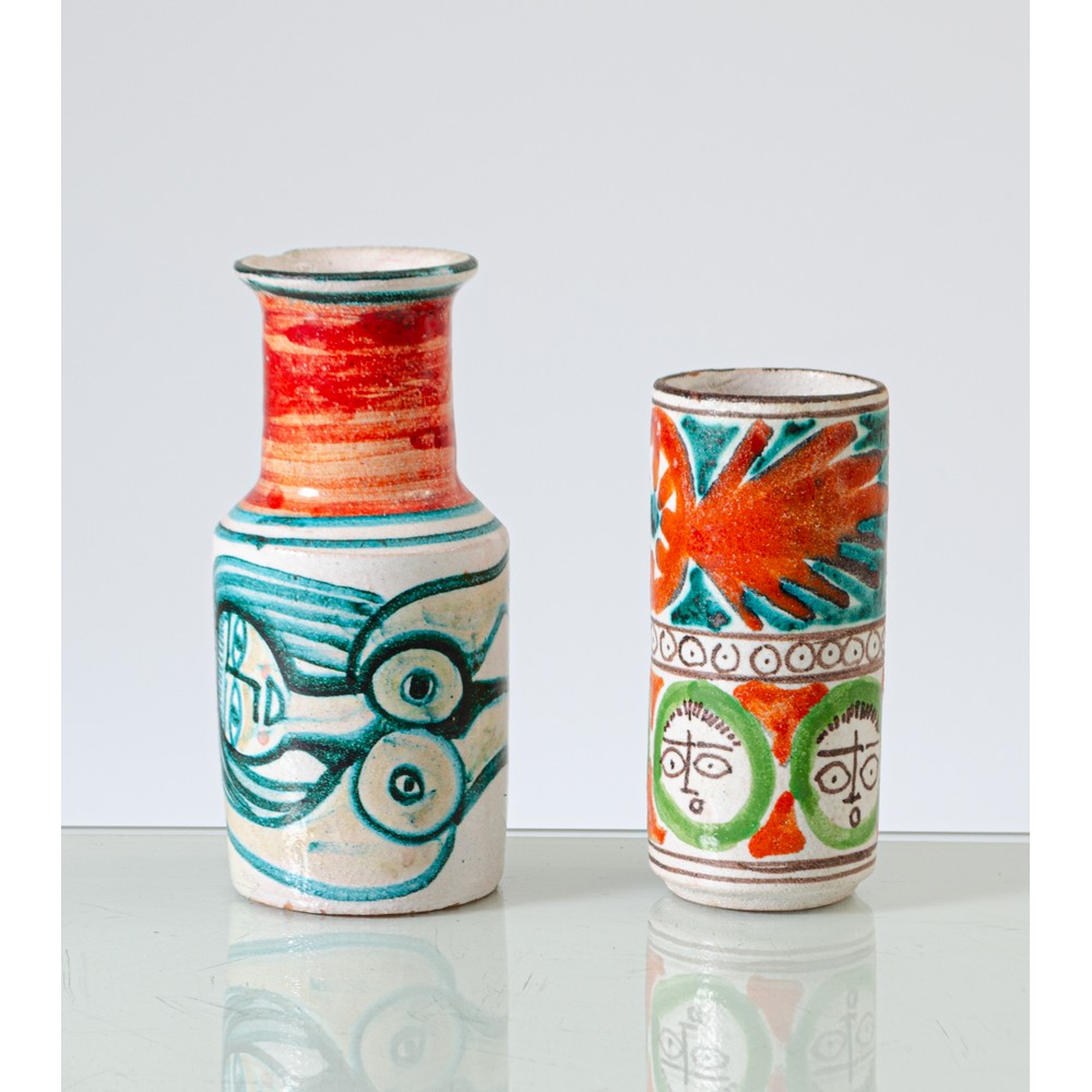 Due vasi in ceramica: un vaso con corpo cilindrico e decorato in verde e rosso con volti e motivi circolari; un vaso con corpo a balaustra e decorato con figura femminile verde, collo a tromba arancione, piccola rottura e sbeccatura. Firma alla base.