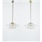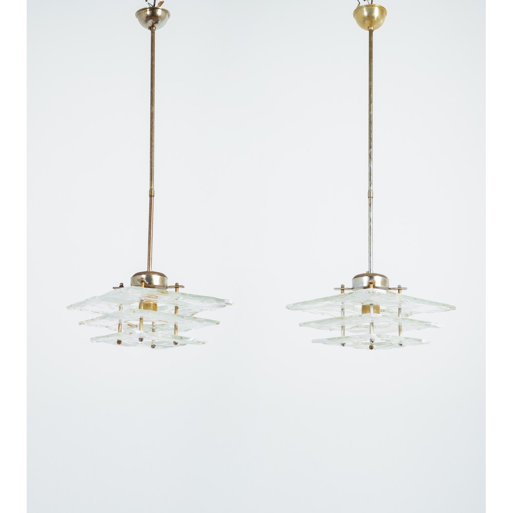 Coppia di lampada a sospensione ad una luce, struttura in ottone e metallo cromato, diffusore composto da tre formelle quadrata sovrapposte in vetro corteccia trasparente e decorato con murrine informali lattime.
