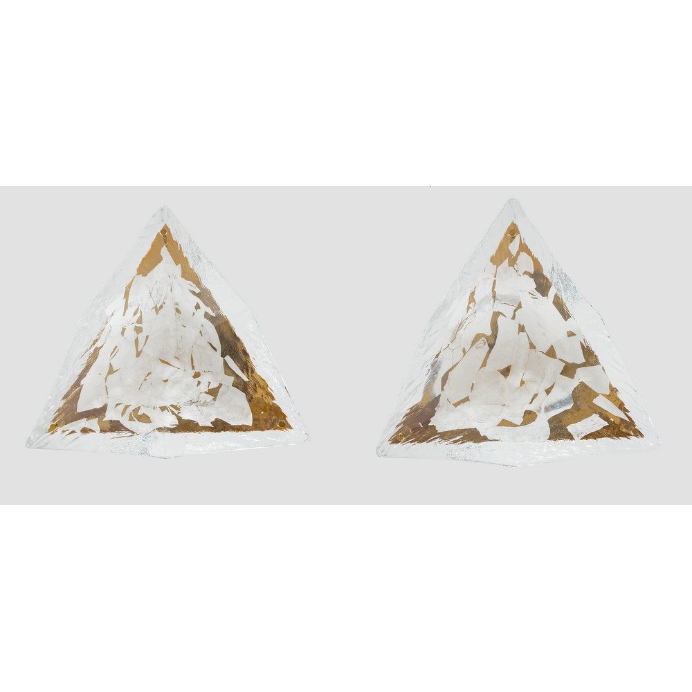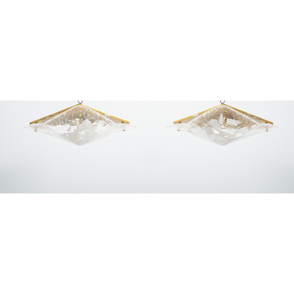Coppia di lampade da soffitto a tre luci, struttura in ottone, diffusore piramidale in vetro corrugato trasparente e decorato con murrine informali lattime.