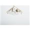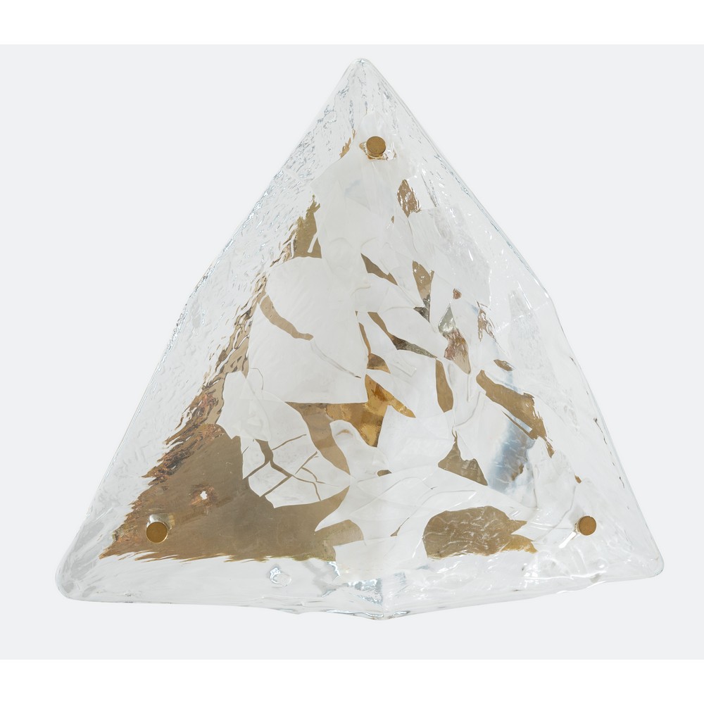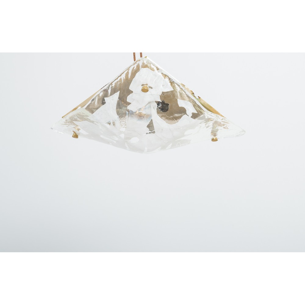 Lampada da soffitto a tre luci, struttura in ottone, diffusore piramidale in vetro corrugato trasparente e decorato con murrine informali lattime.