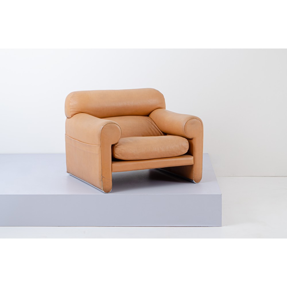 Poltrona modello “Smoking” con struttura in legno, imbottitura e rivestimento in pelle nocciola, acciaio curvato. Segni d’uso e lievi graffi.