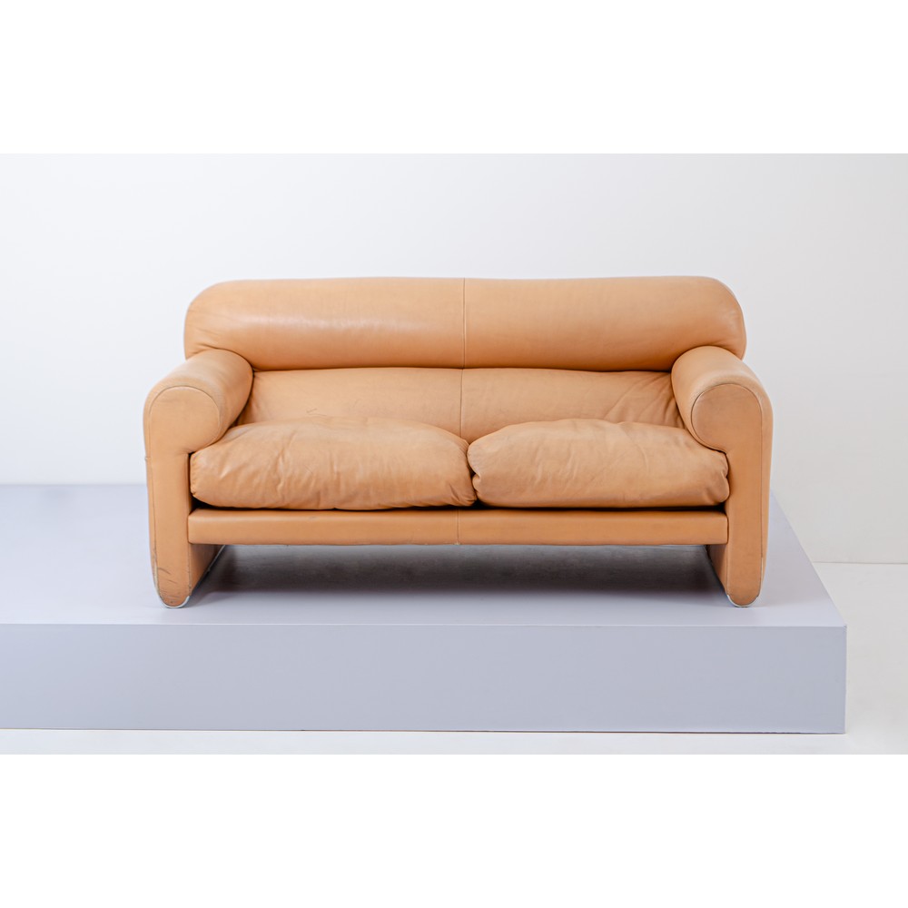Un divano due posti modello “Smoking” con struttura in legno, imbottitura e rivestimento in pelle nocciola, acciaio curvato. Segni d’uso e lievi graffi.
