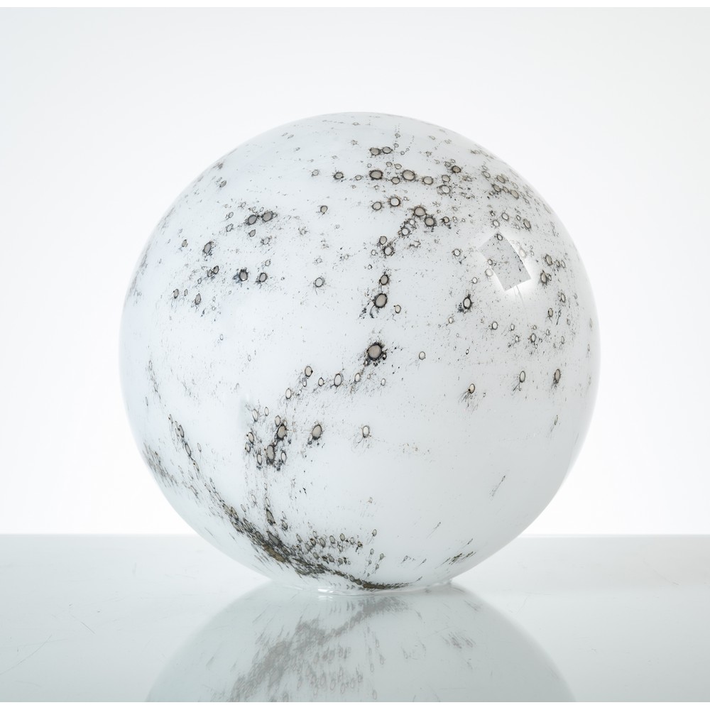 Lampada da tavolo ad una luce, diffusore sferico globulare in vetro lattimo con ossidazioni grigie e nere.