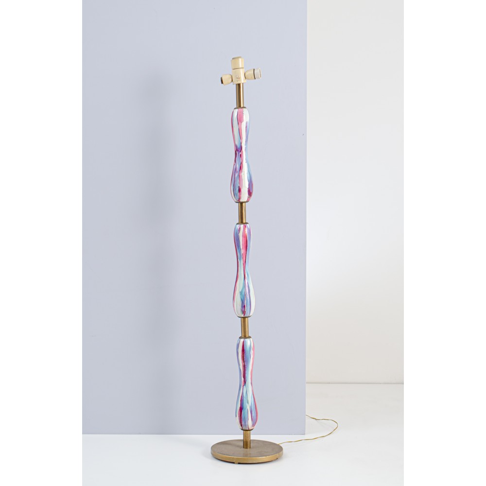 Lampada da terra a due luci, struttura in tubolare di ottone con elementi a barilotto in ceramica bianca decorata con rigature blue e rosse, paralume mancante, base circolare.
