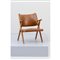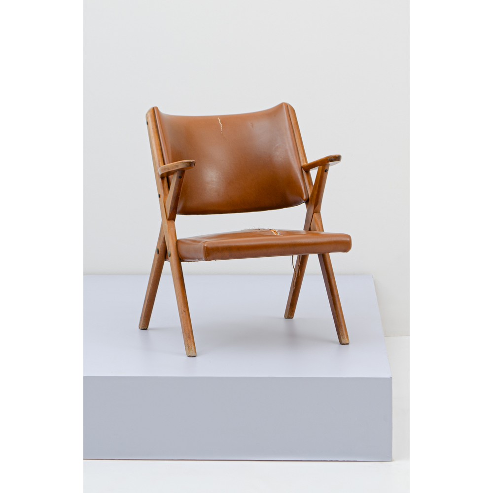 Poltrona con struttura in legno di faggio, spalliera e seduta con imbottitura e rivestimento in vinile marrone. Strappi al rivestimento.