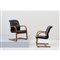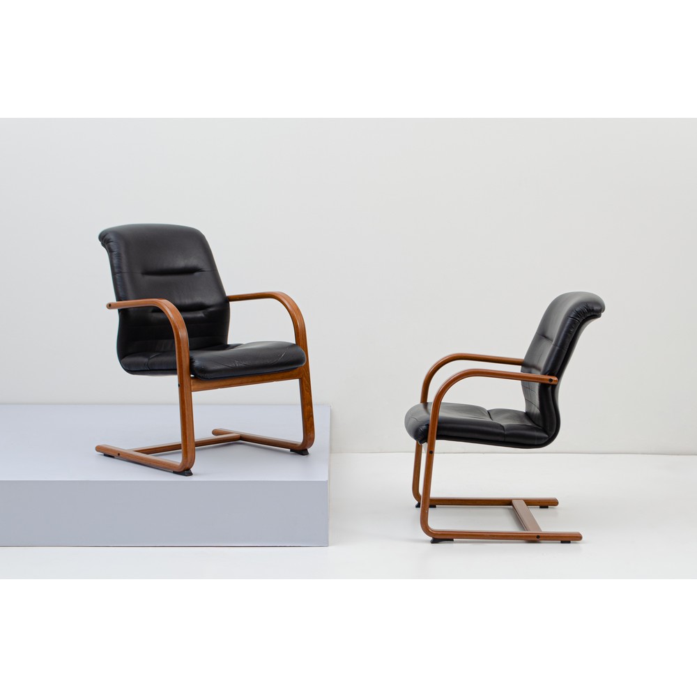 Coppia di poltrone con struttura in legno curvato, seduta e spalliera ergonomiche con imbottitura e rivestimento in pelle nera. Segni d’uso e graffi alla pelle.