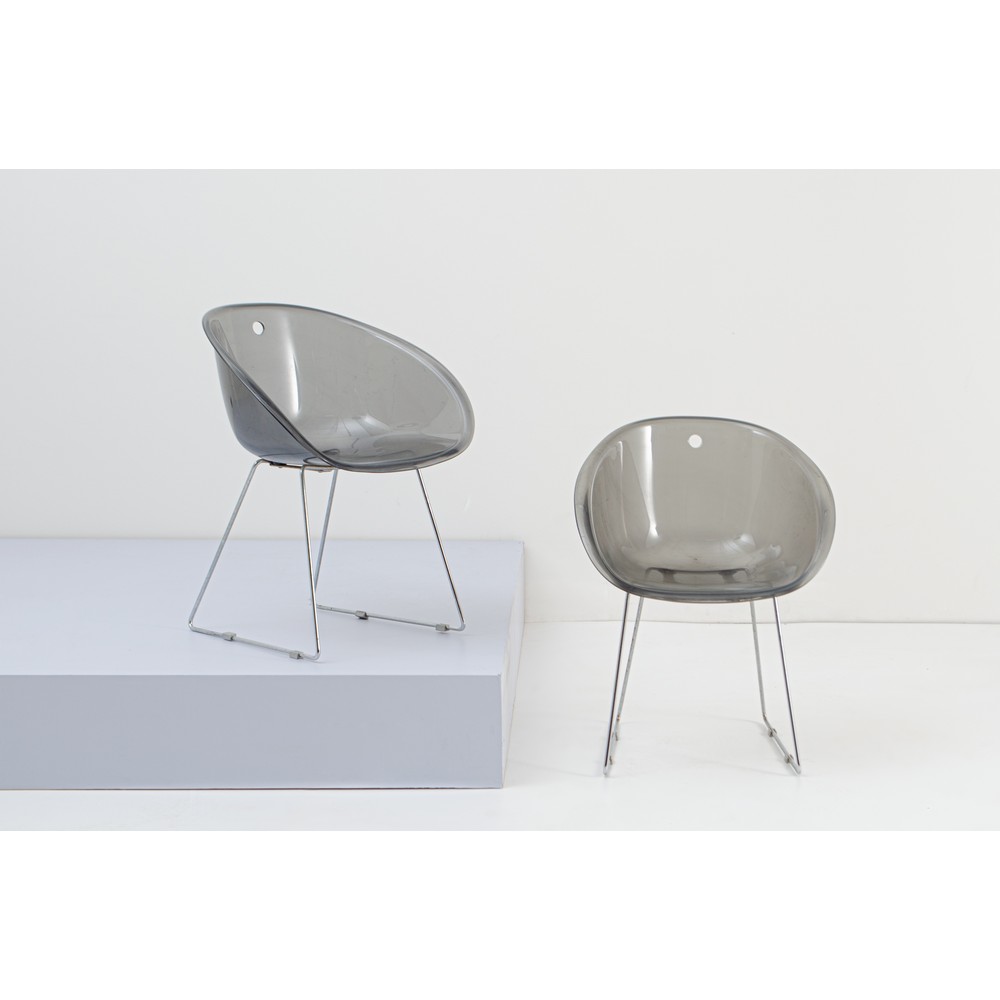 Due poltrone modello “921”, struttura portante in tubolare di acciaio cromato, scocca in policarbonato trasparente grigio. Segni d’uso.