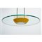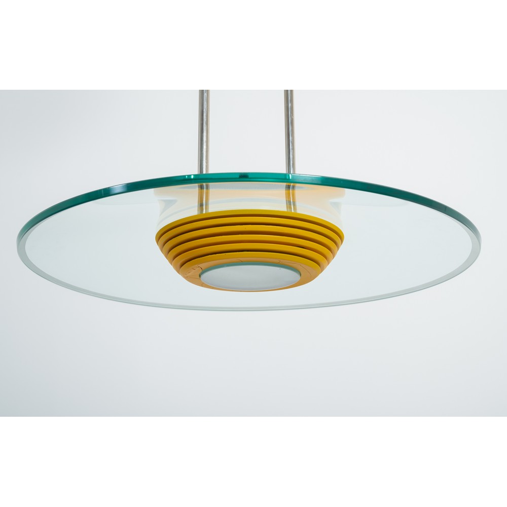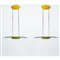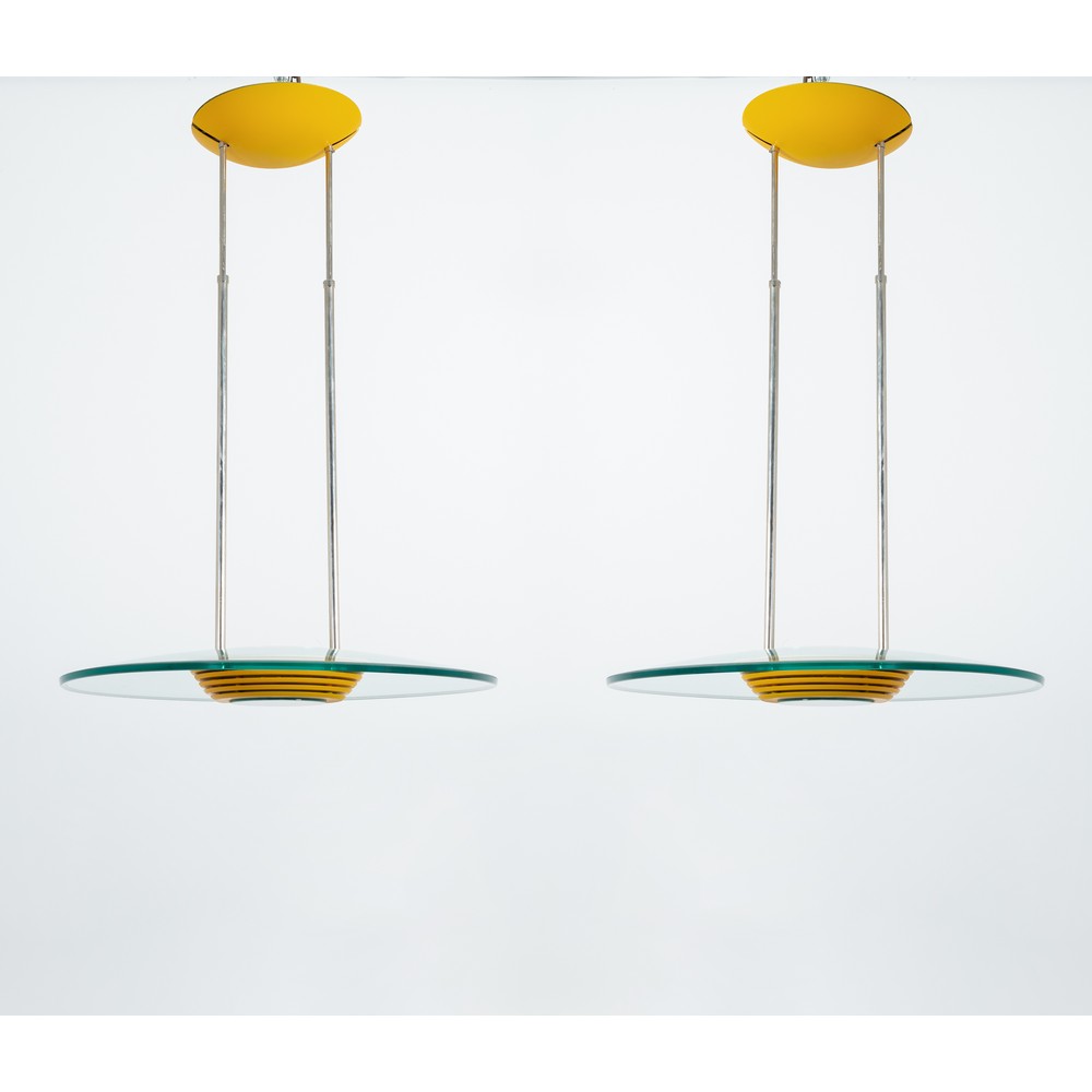 Coppia di lampade a sospensione ad una luce, struttura in metallo verniciato giallo ed acciaio cromato, diffusore circolare a disco in vetro trasparente.