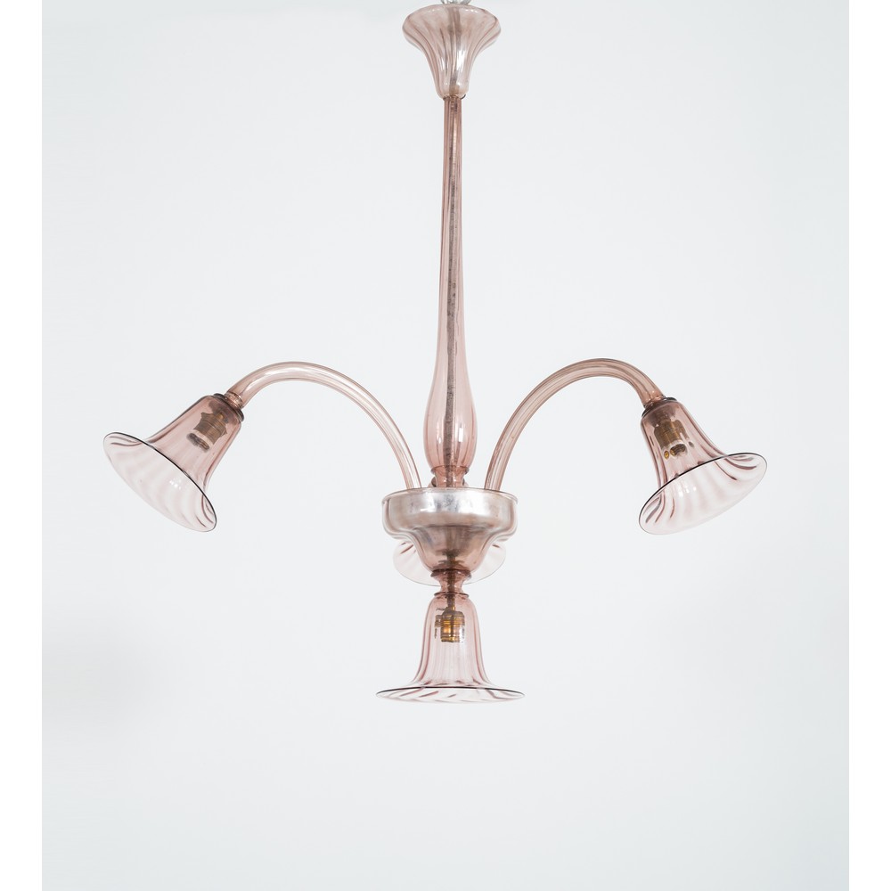 Lampada a sospensione a quattro luci, struttura in metallo, corpo in vetro soffiato lilla con tre bracci ricadenti e diffusori a campana lievemente costolata.