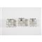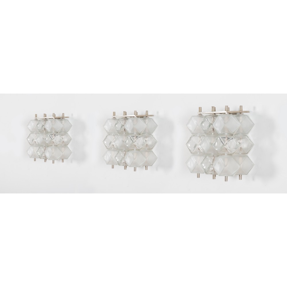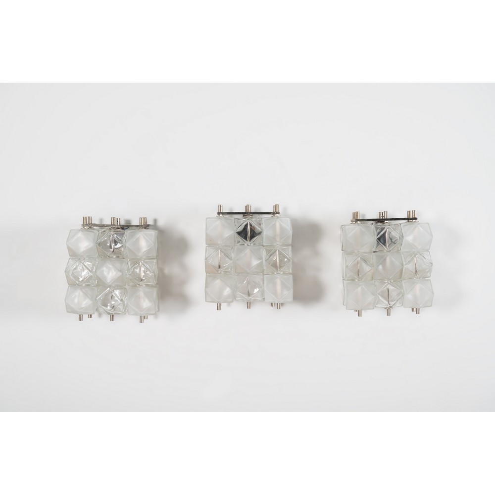 Tre lampade da parete ad una luce, struttura in metallo cromato, diffusori poliedrici in vetro trasparente e lattato.