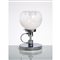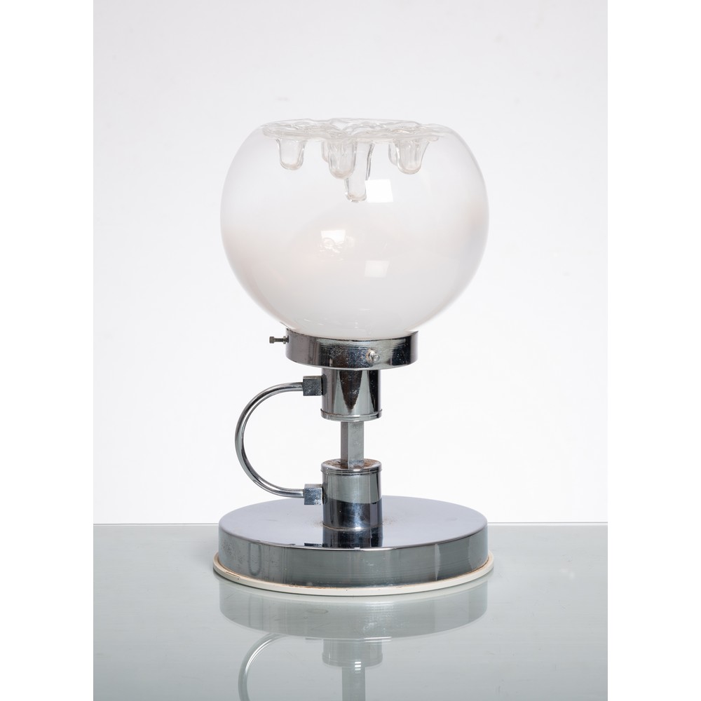 Lampada da tavolo ad una luce, struttura in metallo cromato con diffusore scultura sferico in vetro trasparente e lattato, decoro a gocce inglobate. Lievi ossidazioni.