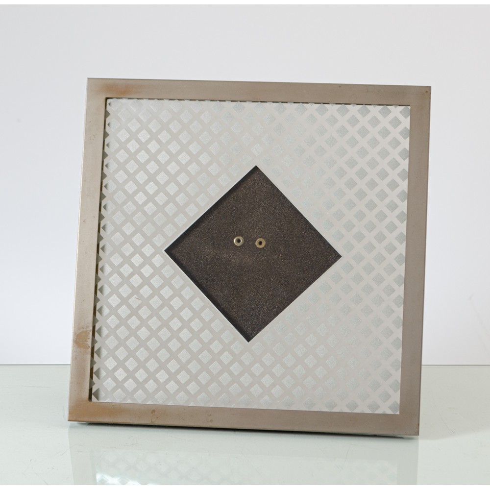 Porta ritratti quadrato, cornice in metallo cromato, passepartout in vetro decorato con motivi a rombi. Ossidazioni e segni d’uso.